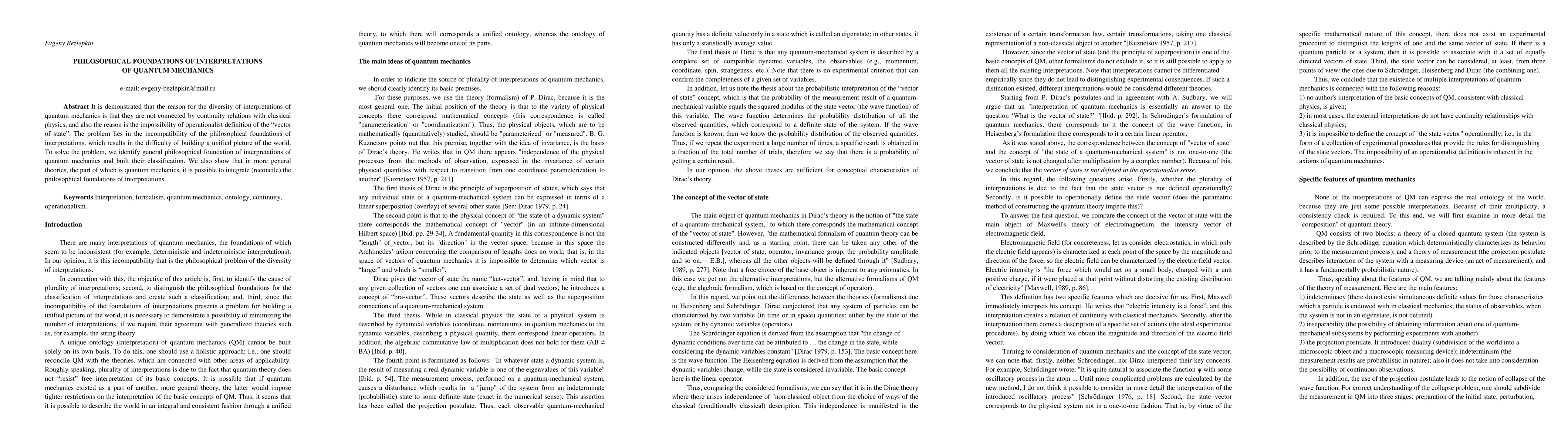 It is demonstrated that the reason for the diversity of interpretations of quantum mechanics is that they are not connected by continuity relations with classical physics, and also the reason is the impossibility of operationalist definition of the vector of state. The problem lies in the incompatibility of the philosophical foundations of interpretations, which results in the difficulty of building a unified picture of the world. To solve the problem, we identify general philosophical foundation of interpretations of quantum mechanics and built their classification. We also show that in more general theories, the part of which is quantum mechanics, it is possible to integrate (reconcile) the philosophical foundations of interpretations.