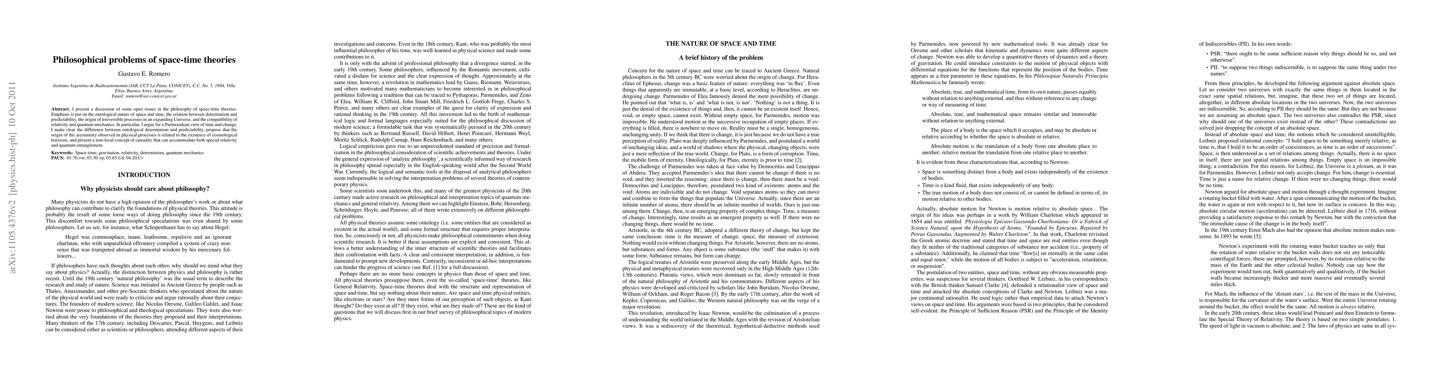 I present a discussion of some open issues in the philosophy of space-time theories. Emphasis is put on the ontological nature of space and time, the relation between determinism and predictability, the origin of irreversible processes in an expanding Universe, and the compatibility of relativity and quantum mechanics. In particular, I argue for a Parmenidean view of time and change, I make clear the difference between ontological determinism and predictability, propose that the origin of the asymmetry observed in physical processes is related to the existence of cosmological horizons, and present a non-local concept of causality that can accommodate both special relativity and quantum entanglement.