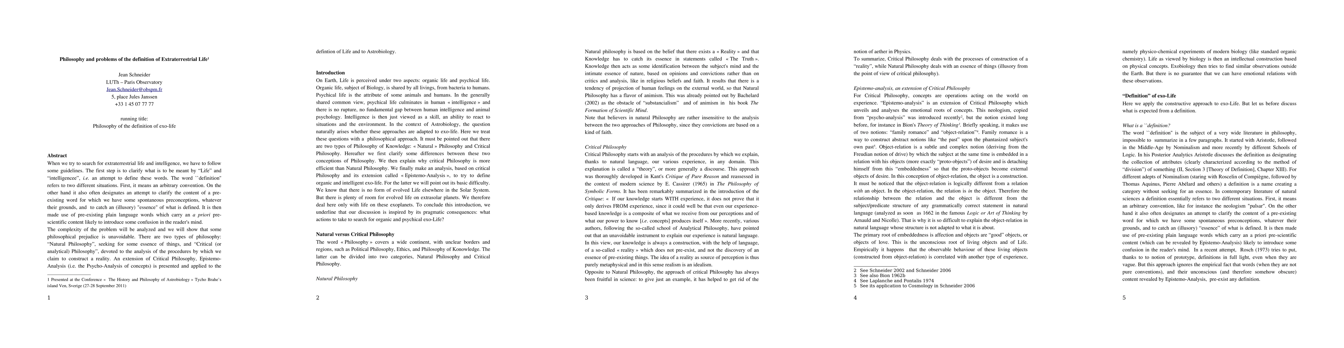 When we try to search for extraterrestrial life and intelligence, we have to follow some guidelines. The first step is to clarify what is to be meant by "Life" and "intelligence", i.e. an attempt to define these words. The word "definition" refers to two different situations. First, it means an arbitrary convention. On the other hand it also often designates an attempt to clarify the content of a pre-existing word for which we have some spontaneous preconceptions, whatever their grounds, and to catch an (illusory) "essence" of what is defined. It is then made use of pre-existing plain language words which carry an a priori pre-scientific content likely to introduce some confusion in the reader's mind. The complexity of the problem will be analyzed and we will show that some philosophical prejudice is unavoidable. There are two types of philosophy: "Natural Philosophy", seeking for some essence of things, and "Critical (or analytical) Philosophy", devoted to the analysis of the procedures by which we claim to construct a reality. An extension of Critical Philosophy, Epistemo-Analysis (i.e. the Psycho-Analysis of concepts) is presented and applied to the defintion of Life and to Astrobiology.