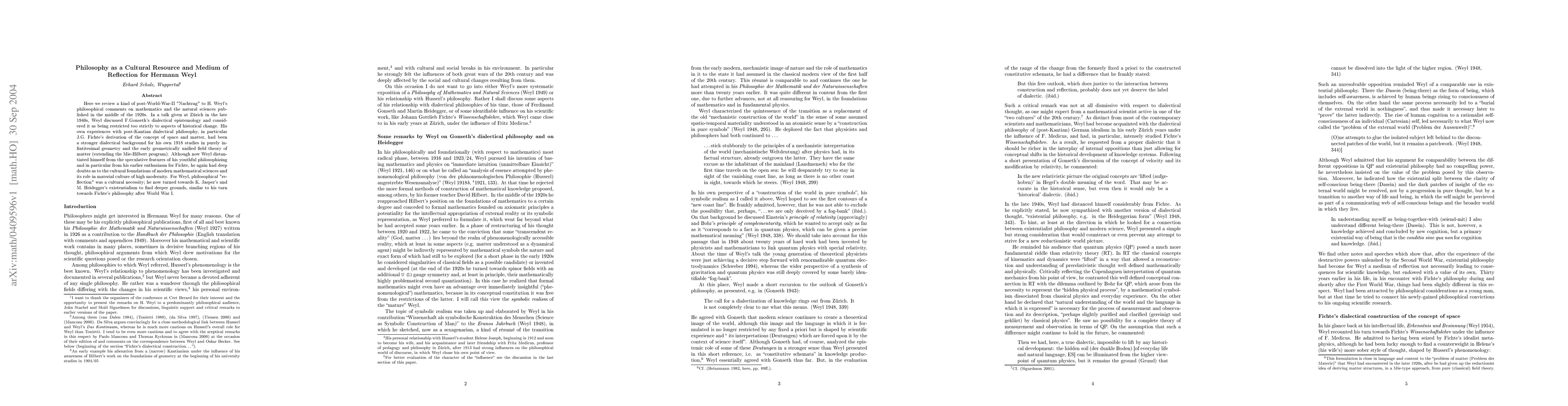 Here we review a kind of post-World-War-II "Nachtrag" to H. Weyl's philosophical comments on mathematics and the natural sciences published in the middle of the 1920s. In a talk given at Z\"urich in the late 1940s, Weyl discussed F.Gonseth's dialectical epistemology and considered it as being restricted too strictly to aspects of historical change. His own experiences with post-Kantian dialectical philosophy, in particular J.G. Fichte's derivation of the concept of space and matter, had been a stronger dialectical background for his own 1918 studies in purely infintitesimal geometry and the early geometrically unified field theory of matter (extending the Mie-Hilbert program). Although now Weyl distantiated himself from the speculative features of his youthful philosophizing and in particular from his earlier enthusiasm for Fichte, he again had deep doubts as to the cultural foundations of modern mathematical sciences and its role in material culture of high modernity. For Weyl, philosophical "reflection" was a cultural necessity; he now turned towards K. Jasper's and M. Heidegger's existentialism to find deeper grounds, similar to his turn towards Fichte's philosophy after World War I.