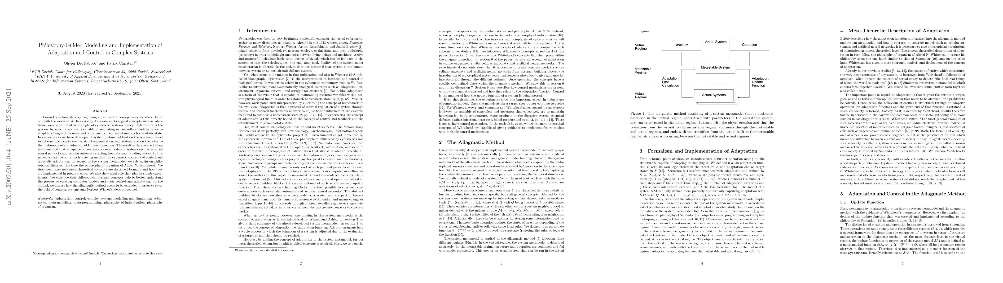 Control was from its very beginning an important concept in cybernetics. Later on, with the works of W. Ross Ashby, for example, biological concepts such as adaptation were interpreted in the light of cybernetic systems theory. Adaptation is the process by which a system is capable of regulating or controlling itself in order to adapt to changes of its inner and outer environment maintaining a homeostatic state. In earlier works we have developed a system metamodel that on the one hand refers to cybernetic concepts such as structure, operation, and system, and on the other to the philosophy of individuation of Gilbert Simondon. The result is the so-called allagmatic method that is capable of creating concrete models of systems such as artificial neural networks and cellular automata starting from abstract building blocks. In this paper, we add to our already existing method the cybernetic concepts of control and especially adaptation. In regard to the system metamodel, we rely again on philosophical theories, this time the philosophy of organism of Alfred N. Whitehead. We show how these new meta-theoretical concepts are described formally and how they are implemented in program code. We also show what role they play in simple experiments. We conclude that philosophical abstract concepts help to better understand the process of creating computer models and their control and adaptation. In the outlook we discuss how the allagmatic method needs to be extended in order to cover the field of complex systems and Norbert Wiener's ideas on control.