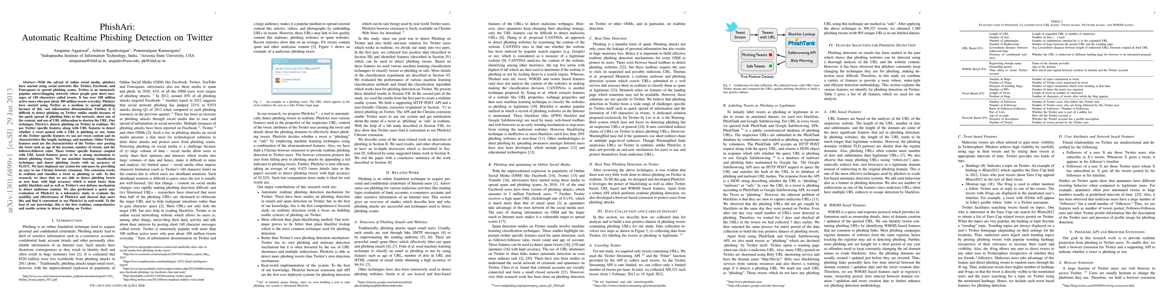 PhishAri is a realtime phishing detection system for Twitter that uses Twitter-specific and URL features to identify phishing tweets with 92.52% accuracy. It employs machine learning and provides a Chrome extension for immediate detection, outperforming public blacklists and Twitter's own defenses.