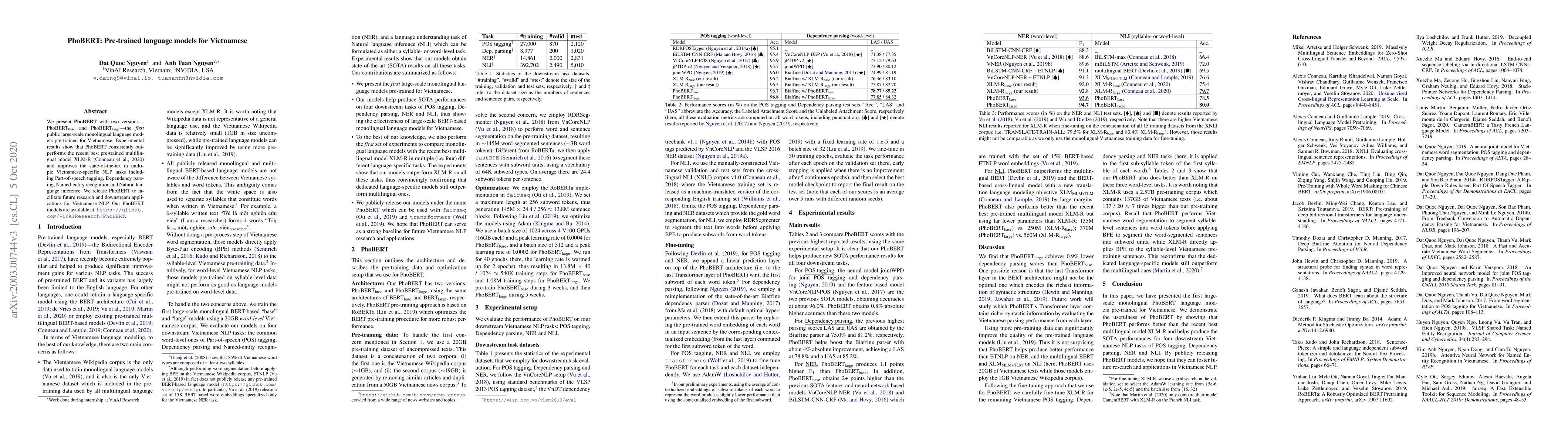 PhoBERT is a pair of pre-trained language models for Vietnamese, PhoBERT-base and PhoBERT-large, which outperform the multilingual model XLM-R in various Vietnamese NLP tasks. The authors release these models to advance Vietnamese NLP research and applications.
