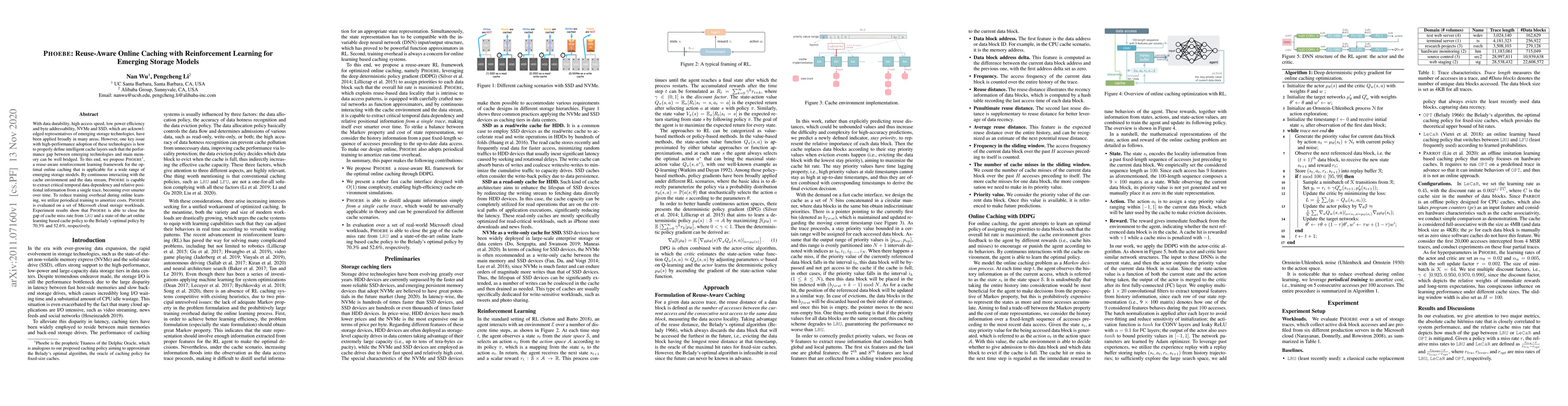 With data durability, high access speed, low power efficiency and byte addressability, NVMe and SSD, which are acknowledged representatives of emerging storage technologies, have been applied broadly in many areas. However, one key issue with high-performance adoption of these technologies is how to properly define intelligent cache layers such that the performance gap between emerging technologies and main memory can be well bridged. To this end, we propose Phoebe, a reuse-aware reinforcement learning framework for the optimal online caching that is applicable for a wide range of emerging storage models. By continuous interacting with the cache environment and the data stream, Phoebe is capable to extract critical temporal data dependency and relative positional information from a single trace, becoming ever smarter over time. To reduce training overhead during online learning, we utilize periodical training to amortize costs. Phoebe is evaluated on a set of Microsoft cloud storage workloads. Experiment results show that Phoebe is able to close the gap of cache miss rate from LRU and a state-of-the-art online learning based cache policy to the Belady's optimal policy by 70.3% and 52.6%, respectively.