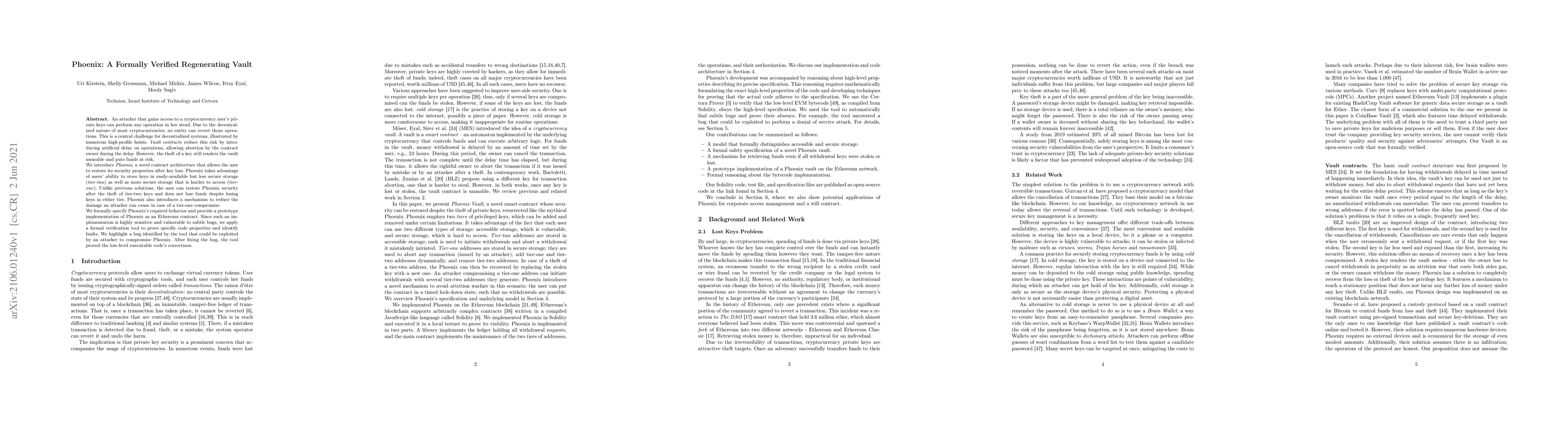 The research introduces Phoenix, a formally verified regenerating vault contract for cryptocurrencies, implemented in Solidity and verified using the Certora Prover.