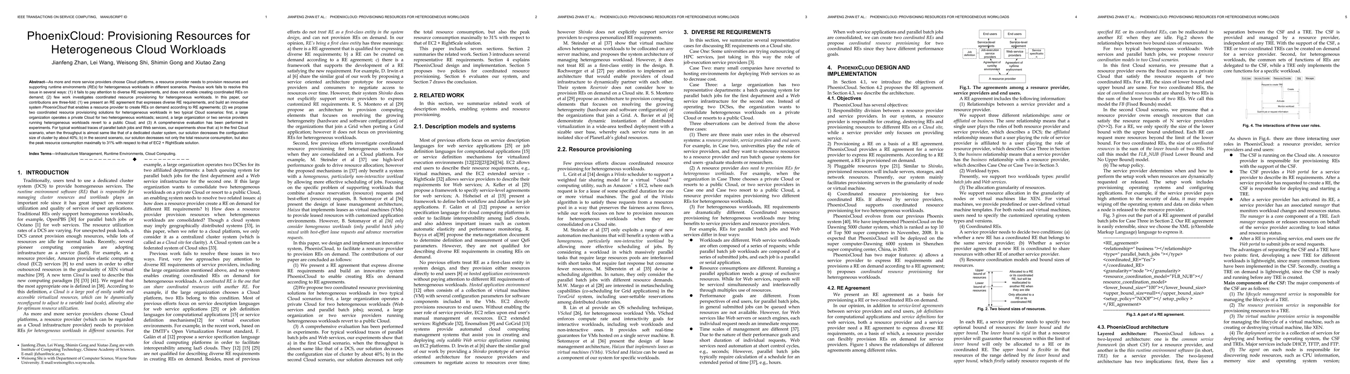 PhoenixCloud introduces an innovative system for provisioning runtime environments (REs) on demand to meet diverse RE requirements for heterogeneous workloads. It offers two coordinated resource provisioning solutions for private and public cloud scenarios, significantly reducing resource consumption and configuration size compared to existing solutions.