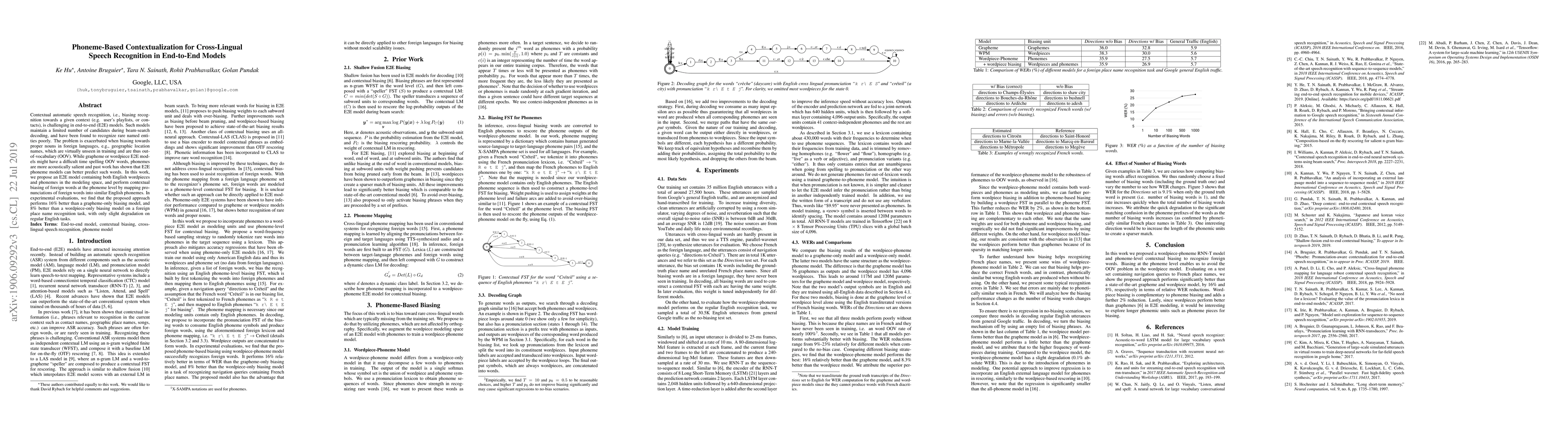This paper proposes an end-to-end speech recognition model that incorporates both English wordpieces and phonemes to improve recognition of out-of-vocabulary foreign words. The approach contextually biases recognition towards foreign proper nouns by mapping their pronunciations to similar English phonemes, achieving better results than grapheme or wordpiece-only models.