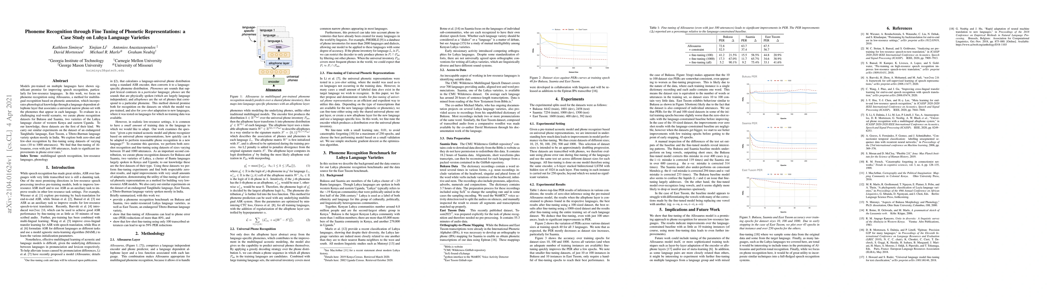 This paper investigates phoneme recognition for low-resource languages using Allosaurus, a multilingual recognition method. It curates datasets for Bukusu and Saamia, two Luhya language varieties, and finds significant improvements in phone error rates through fine-tuning with as few as 100 utterances.
