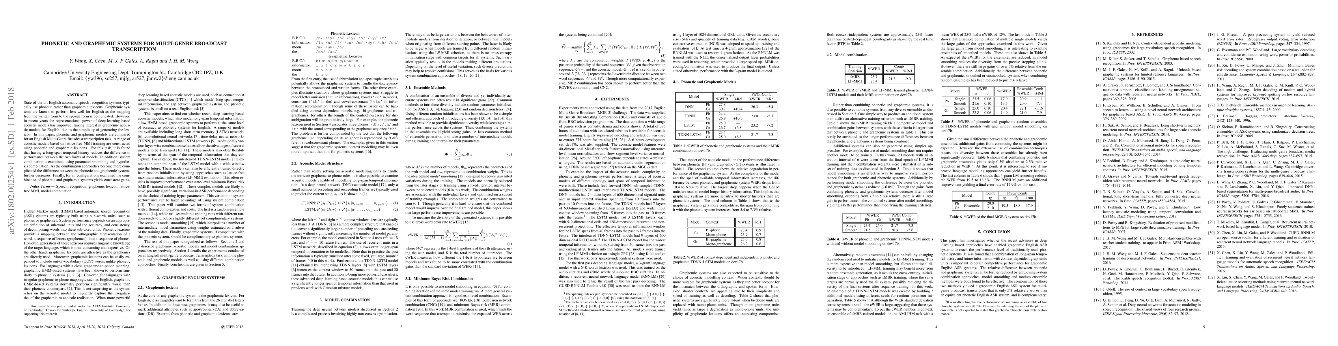 This paper compares phonetic and graphemic models for English Multi-Genre Broadcast transcription, finding that long-span temporal history reduces performance differences, and system combination further diminishes this gap, with combined models consistently outperforming individual models.
