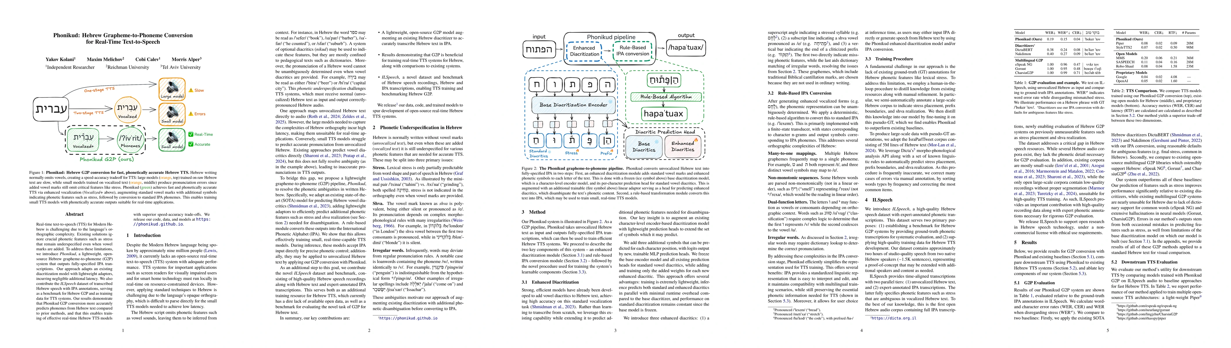 The research introduces Phonikud, a lightweight, open-source Hebrew grapheme-to-phoneme (G2P) system that outputs fully-specified IPA transcriptions. It adapts an existing diacritization model with lightweight adaptors, incurring negligible additional latency. The ILSpeech dataset, containing transcribed Hebrew speech with IPA annotations, is also contributed as a benchmark for Hebrew G2P and training data for TTS systems.