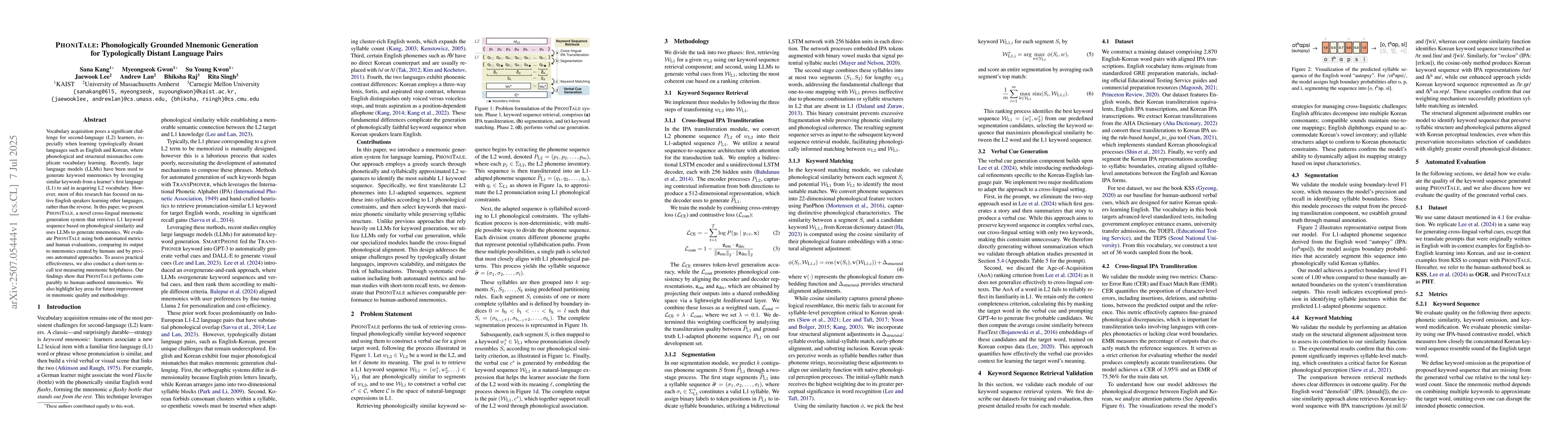 Vocabulary acquisition poses a significant challenge for second-language (L2) learners, especially when learning typologically distant languages such as English and Korean, where phonological and structural mismatches complicate vocabulary learning. Recently, large language models (LLMs) have been used to generate keyword mnemonics by leveraging similar keywords from a learner's first language (L1) to aid in acquiring L2 vocabulary. However, most of this research has focused on native English speakers learning other languages, rather than the reverse. In this paper, we present PhoniTale, a novel cross-lingual mnemonic generation system that retrieves L1 keyword sequence based on phonological similarity and uses LLMs to generate mnemonics. We evaluate PhoniTale using both automated metrics and human evaluations, comparing its output to mnemonics created by humans and by previous automated approaches. To assess practical effectiveness, we also conduct a short-term recall test measuring mnemonic helpfulness. Our findings show that PhoniTale performs comparably to human-authored mnemonics. We also highlight key areas for future improvement in mnemonic quality and methodology.