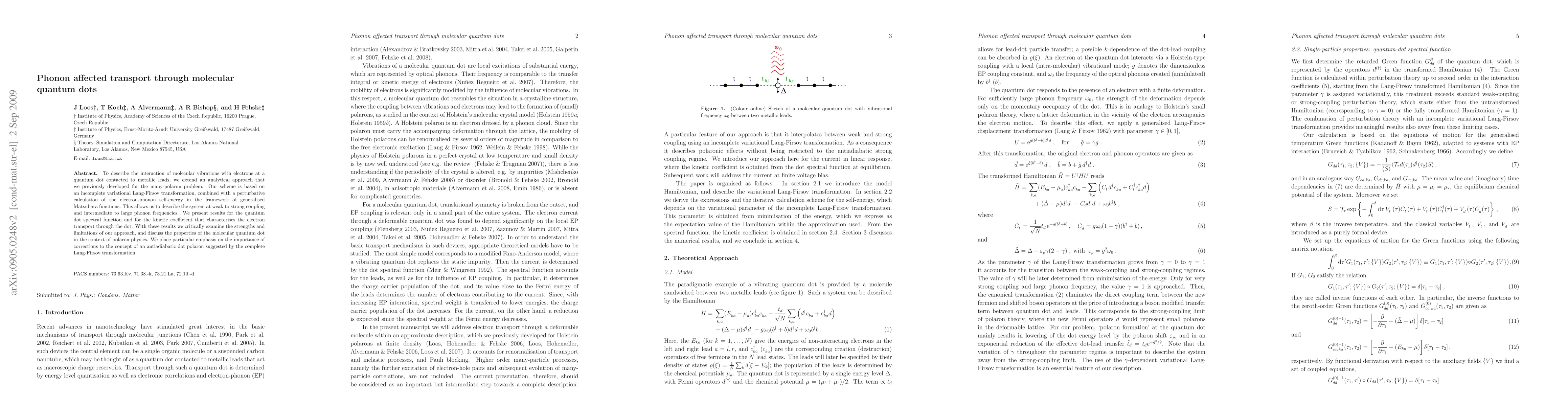 This paper extends an analytical approach to describe electron-phonon interactions in molecular quantum dots connected to metallic leads, using a variational Lang-Firsov transformation and generalised Matsubara functions. The study examines the quantum dot's spectral function and transport properties, highlighting the significance of non-adiabatic effects in polaron physics.