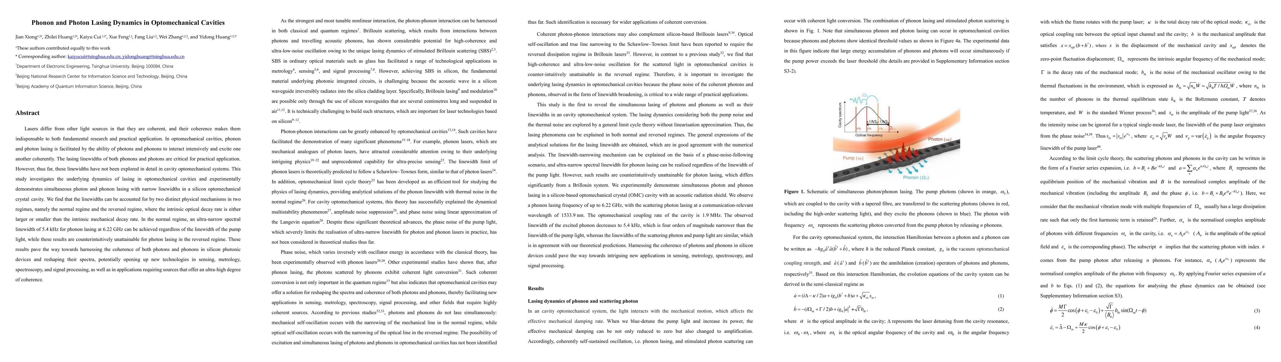 This study investigates the dynamics of phonon and photon lasing in optomechanical cavities, demonstrating simultaneous lasing with narrow linewidths in a silicon optomechanical crystal cavity. The research reveals distinct mechanisms governing linewidths in normal and reversed regimes, achieving an ultra-narrow phonon lasing linewidth of 5.4 kHz, which could advance coherence-based technologies in various applications.