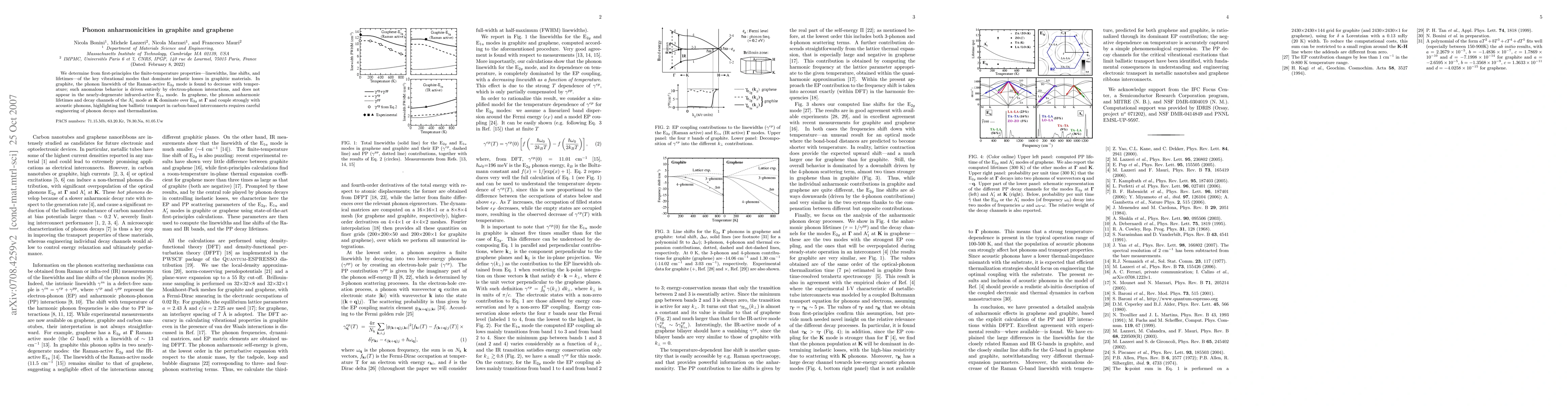 This paper investigates phonon anharmonicities in graphite and graphene using first-principles calculations, revealing that the Raman-active E2g mode in graphite exhibits a temperature-dependent decrease in phonon linewidth due to electron-phonon interactions. In graphene, the A'1 mode at K has significant phonon anharmonic lifetimes and decay channels that dominate over the E2g mode, emphasizing the need for careful engineering of phonon decays in carbon-based interconnects.