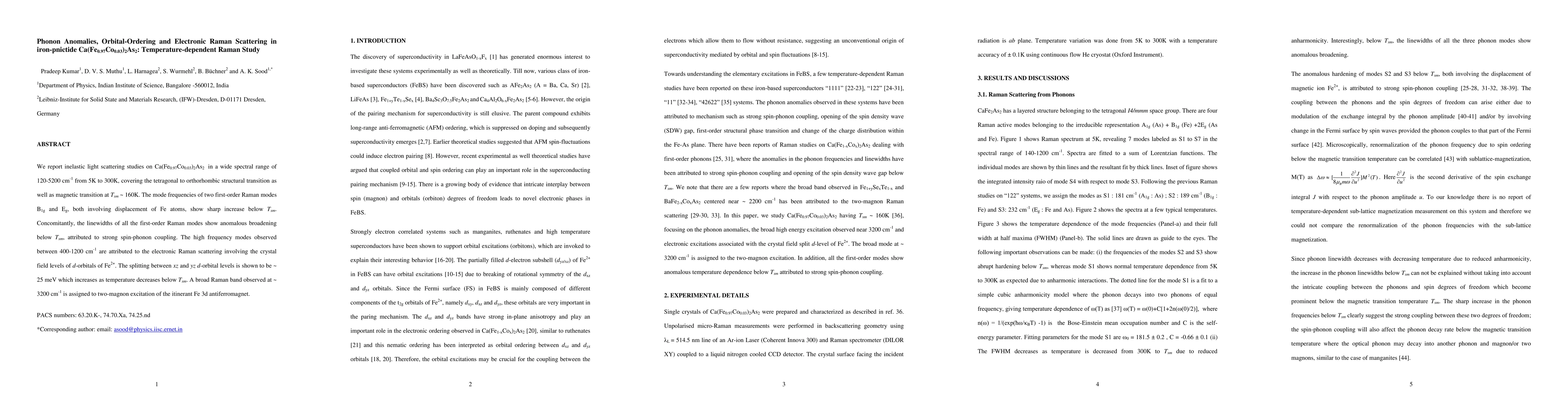 This research investigates Ca(Fe0.97Co0.03)2As2 using temperature-dependent Raman spectroscopy from 5K to 300K. Key findings include sharp increases in mode frequencies of B1g and Eg below the magnetic transition temperature Tsm (~160K), attributed to spin-phonon coupling. Anomalous broadening of all first-order Raman modes is observed below Tsm. High-frequency modes between 400-1200 cm-1 are identified as electronic Raman scattering from Fe2+ crystal field levels, with an xz-yz orbital splitting of ~25 meV increasing with decreasing temperature. A broad band at ~3200 cm-1 is assigned to two-magnon excitation in the Fe 3d antiferromagnet.