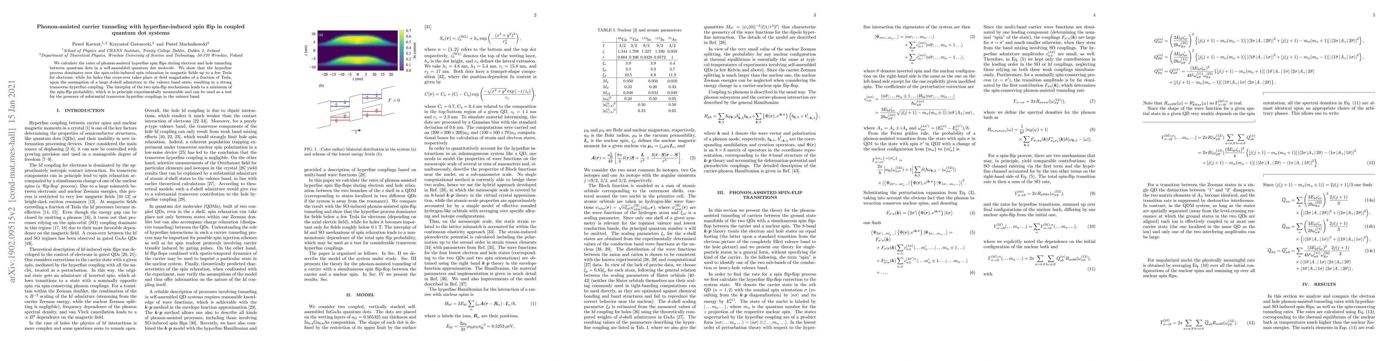 This paper investigates phonon-assisted hyperfine spin flips in quantum dot molecules, demonstrating that hyperfine processes dominate over spin-orbit-induced relaxation for electrons in magnetic fields up to a few Tesla, and for holes at lower field strengths due to strong transverse hyperfine coupling. The study reveals a measurable minimum in spin-flip probability that can verify significant transverse hyperfine interactions in the valence band.