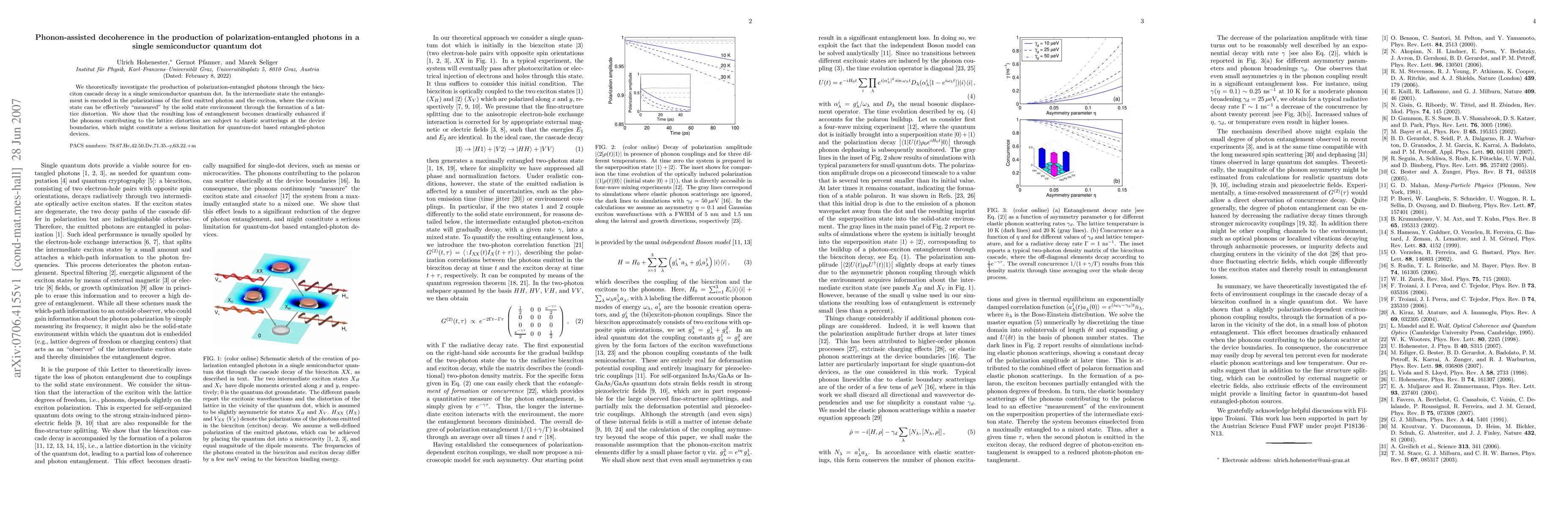 This paper investigates the production of polarization-entangled photons via biexciton decay in a semiconductor quantum dot, highlighting how phonon-induced lattice distortions lead to decoherence. It finds that elastic scattering of phonons at device boundaries can significantly enhance this decoherence, posing a challenge for quantum-dot-based entangled-photon applications.