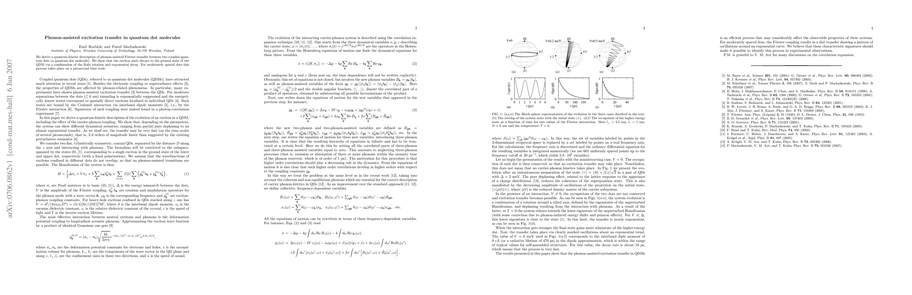 Summary: This paper presents a quantum-kinetic model for phonon-assisted Förster resonance energy transfer in quantum dot molecules, demonstrating that exciton decay occurs via a blend of Rabi rotation and exponential decay, occurring within picoseconds for intermediate dot spacing.