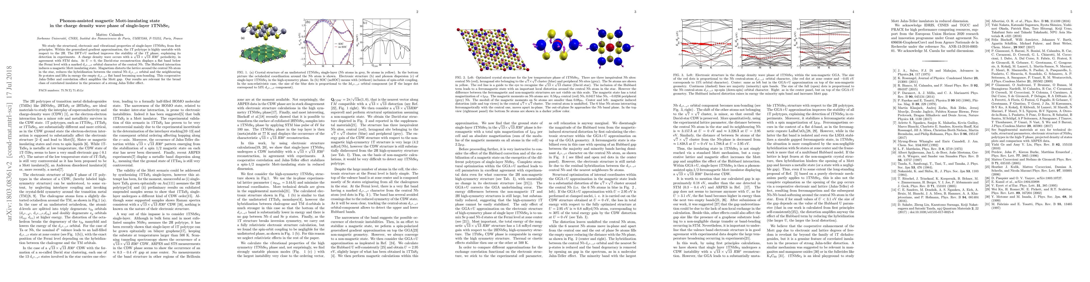 Single-layer 1TNbSe2 exhibits a phonon-assisted magnetic Mott insulating state with a flat band below the Fermi level that amplifies the Mott gap through cooperative lattice and magnetic effects.