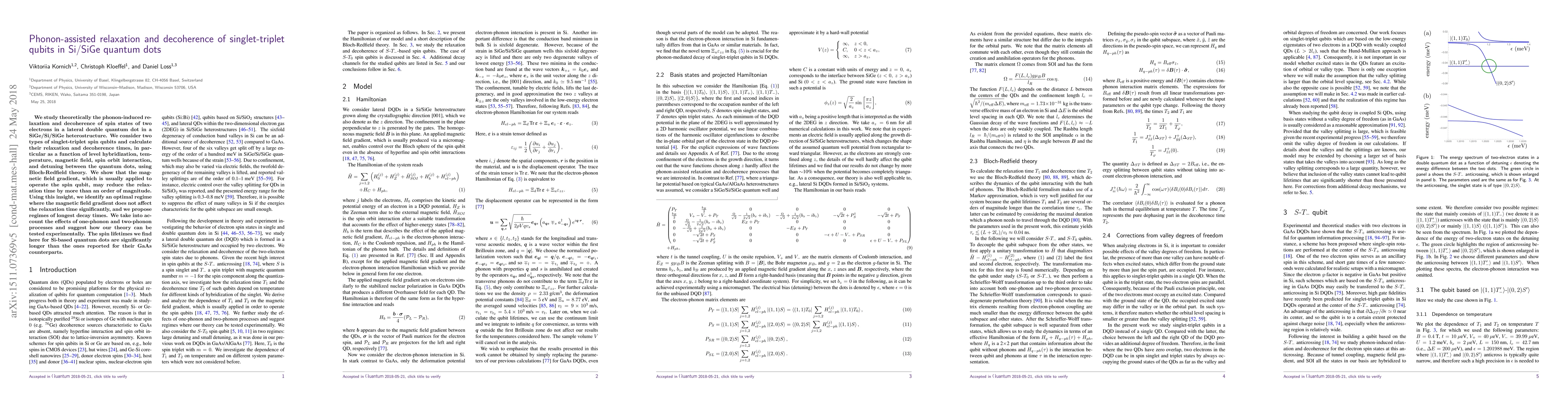 This paper theoretically investigates phonon-induced relaxation and decoherence in singlet-triplet spin qubits within SiGe/Si/SiGe heterostructures, identifying optimal conditions for prolonged spin lifetimes and suggesting experimental verification. The study finds that Si-based quantum dots exhibit longer spin lifetimes compared to GaAs counterparts.