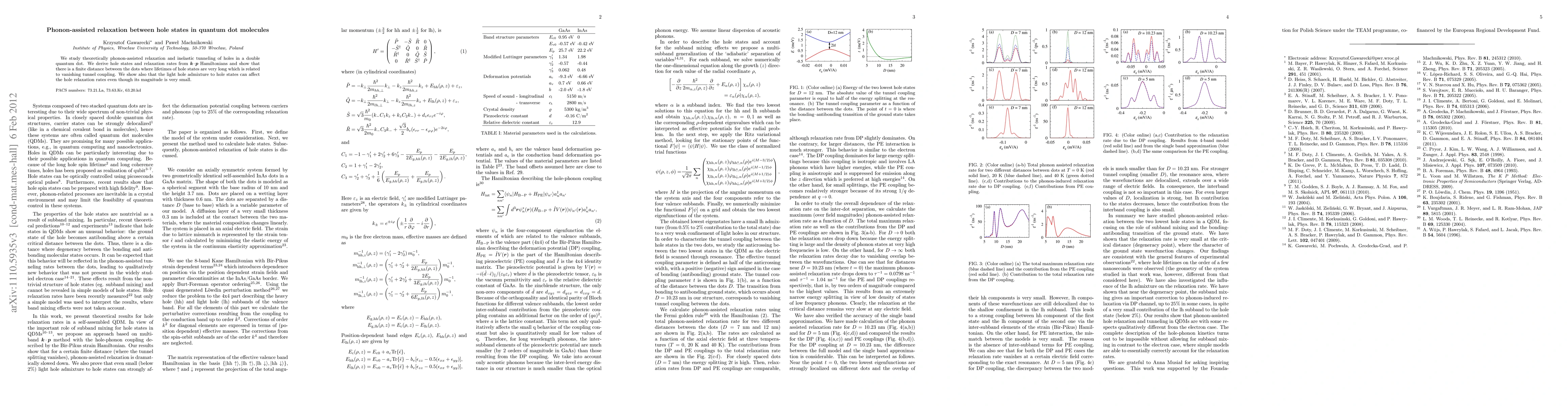 This research theoretically investigates phonon-assisted relaxation and inelastic tunneling of holes in double quantum dots, revealing long hole state lifetimes at specific inter-dot distances due to vanishing tunnel coupling, and highlighting the significant impact of light hole admixture on relaxation rates despite its small magnitude.