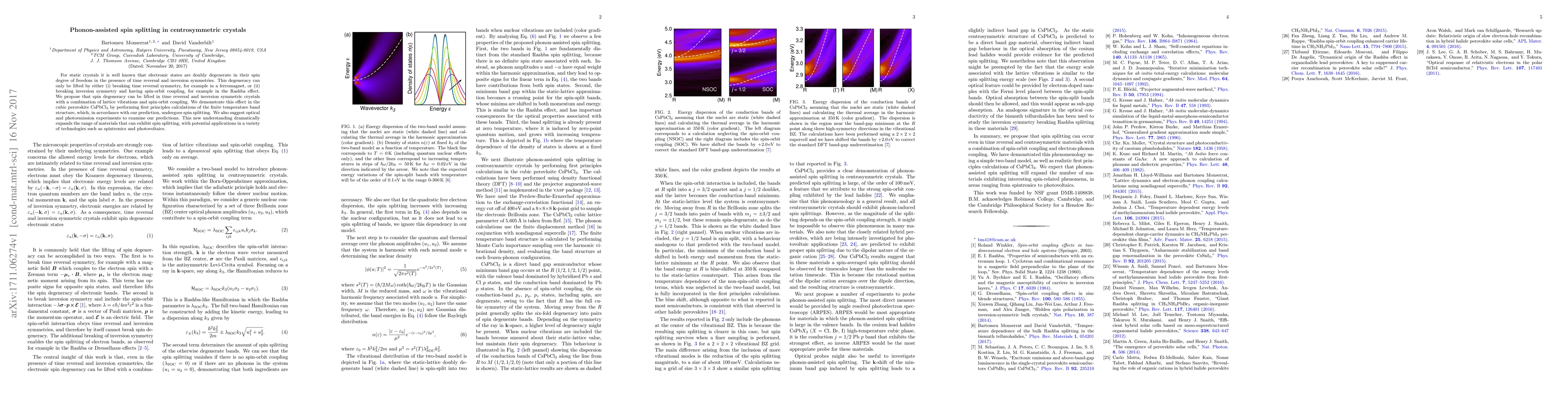 For static crystals it is well known that electronic states are doubly degenerate in their spin degree of freedom in the presence of time reversal and inversion symmetries. This degeneracy can only be lifted by either (i) breaking time reversal symmetry, for example in a ferromagnet, or (ii) breaking inversion symmetry and having spin orbit coupling, for example in the Rashba effect. We propose that spin degeneracy can be lifted in time reversal and inversion symmetric crystals with a combination of lattice vibrations and spin-orbit coupling. We demonstrate this effect in the cubic perovskite CsPbCl$_3$ by performing first principles calculations of the finite temperature band structure, which, in accordance with our prediction, undergoes spin splitting. We also suggest optical and photoemission experiments to examine our predictions. This new understanding dramatically expands the range of materials that can exhibit spin splitting, with potential applications in a variety of technologies such as spintronics and photovoltaics.