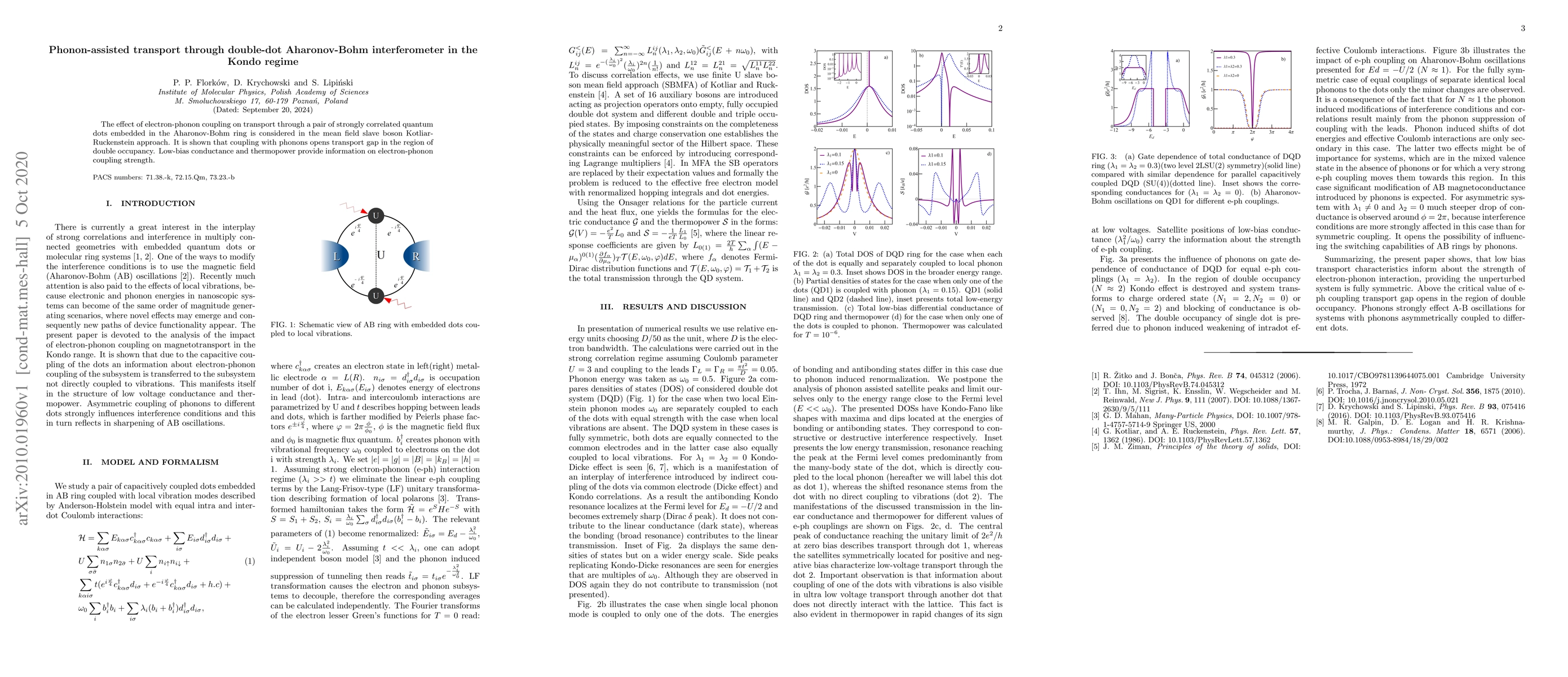 Summary: This study explores how electron-phonon coupling influences transport in a double-dot Aharonov-Bohm interferometer under Kondo regime conditions, revealing a transport gap due to phonon interactions and using low-bias conductance and thermopower to infer coupling strength.