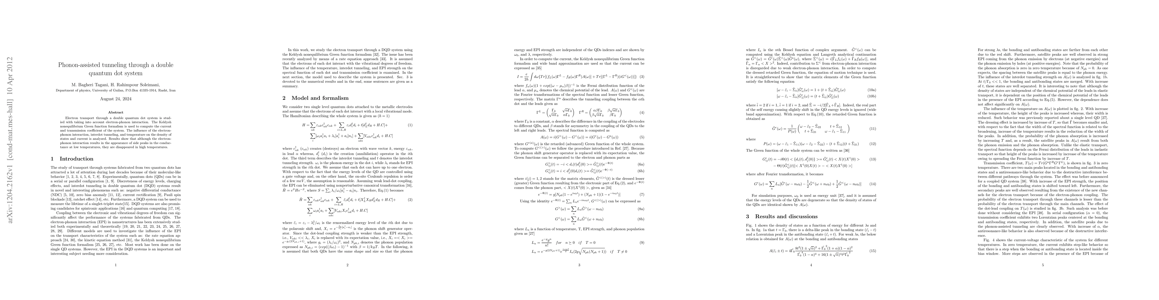 This study investigates electron transport in a double quantum dot system, focusing on the effects of electron-phonon interaction using the Keldysh nonequilibrium Green function formalism. Results reveal that phonon-assisted tunneling generates side peaks in conductance at low temperatures, which vanish at higher temperatures.
