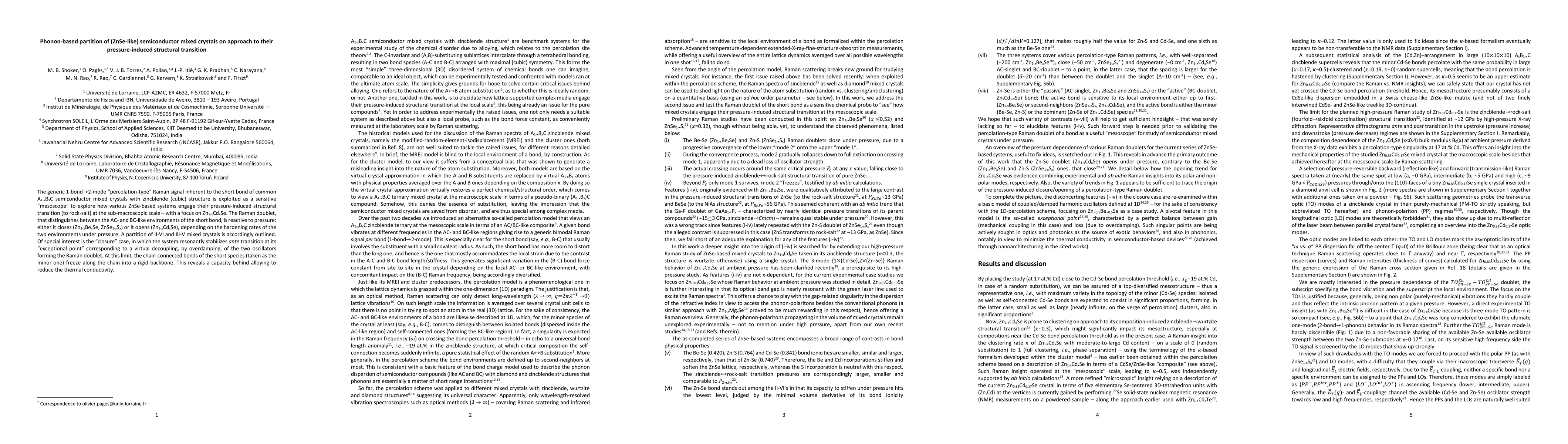 The generic 1-bond:2-mode percolation type Raman signal inherent to the short bond of common (A,B)C semiconductor mixed crystals with zincblende (cubic) structure is exploited as a sensitive mesoscope to explore how various ZnSe-based systems engage their pressure-induced structural transition (to rock-salt) at the sub-macroscopic scale with a focus on ZnCdSe. The Raman doublet, that distinguishes between the AC- and BC-like environments of the short bond, is reactive to pressure: either it closes (ZnBeSe, ZnSeS) or it opens (ZnCdSe), depending on the hardening rates of the two environments under pressure. A partition of II-VI and III-V mixed crystals is accordingly outlined. Of special interest is the closure case, in which the system resonantly stabilizes ante transition at its exceptional point corresponding to a virtual decoupling, by overdamping, of the two oscillators forming the Raman doublet. At this limit, the chain-connected bonds of the short species (taken as the minor one) freeze along the chain into a rigid backbone. This reveals a capacity behind alloying to reduce the thermal conductivity.