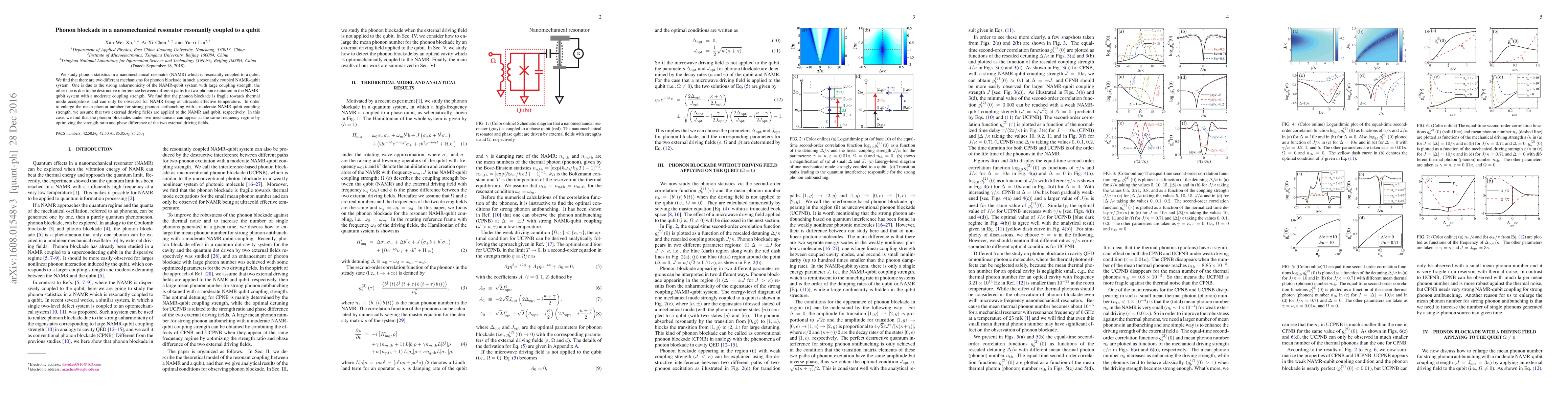This paper investigates phonon blockade in a nanomechanical resonator (NAMR) resonantly coupled to a qubit, identifying two mechanisms: strong anharmonicity and destructive interference. The phonon blockade is fragile to thermal noise and requires ultracold temperatures, but can be optimized with external driving fields to appear under both mechanisms.