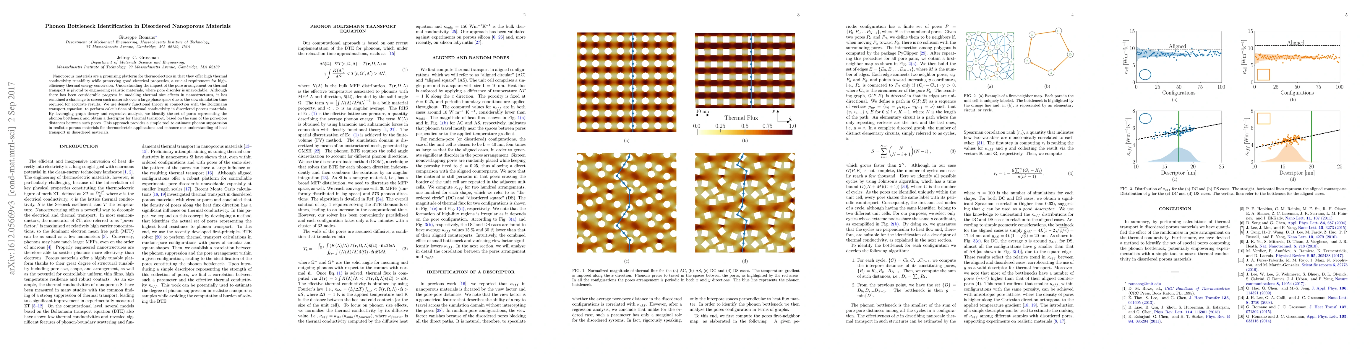 Nanoporous materials are a promising platform for thermoelectrics in that they offer high thermal conductivity tunability while preserving good electrical properties, a crucial requirement for high- effciency thermal energy conversion. Understanding the impact of the pore arrangement on thermal transport is pivotal to engineering realistic materials, where pore disorder is unavoidable. Although there has been considerable progress in modeling thermal size effects in nanostructures, it has remained a challenge to screen such materials over a large phase space due to the slow simulation time required for accurate results. We use density functional theory in connection with the Boltzmann transport equation, to perform calculations of thermal conductivity in disordered porous materials. By leveraging graph theory and regressive analysis, we identify the set of pores representing the phonon bottleneck and obtain a descriptor for thermal transport, based on the sum of the pore-pore distances between such pores. This approach provides a simple tool to estimate phonon suppression in realistic porous materials for thermoelectric applications and enhance our understanding of heat transport in disordered materials.
