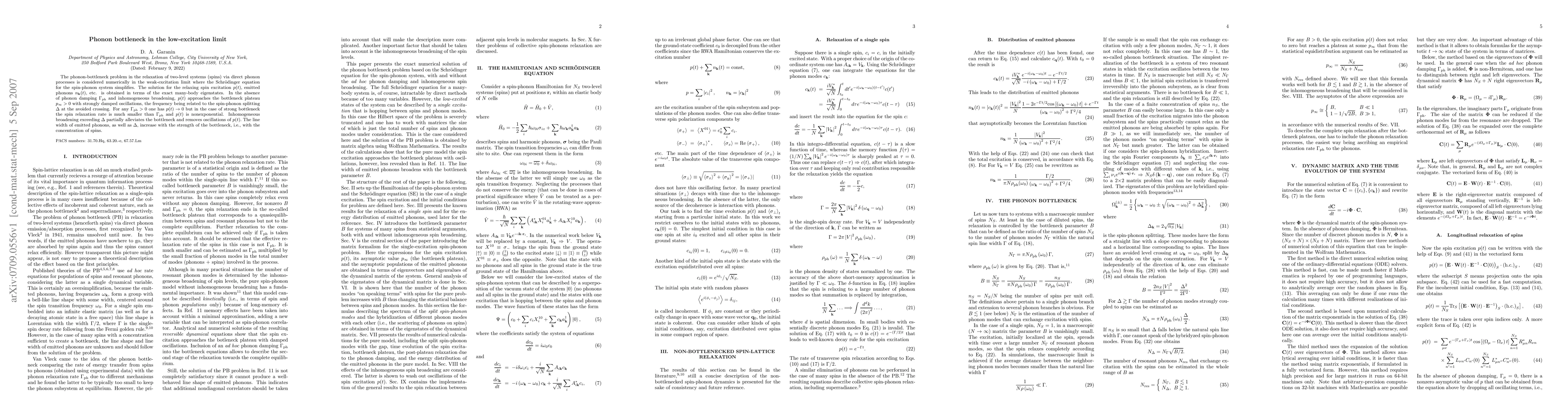 The phonon-bottleneck problem in the relaxation of two-level systems (spins) via direct phonon processes is considered numerically in the weak-excitation limit where the Schroedinger equation for the spin-phonon system simplifies. The solution for the relaxing spin excitation p(t), emitted phonons n_k(t), etc. is obtained in terms of the exact many-body eigenstates. In the absence of phonon damping Gamma_{ph} and inhomogeneous broadening, p(t) approaches the bottleneck plateau p_\infty > 0 with strongly damped oscillations, the frequency being related to the spin-phonon splitting Delta at the avoided crossing. For any Gamma_{ph} > 0 one has p(t) -> 0 but in the case of strong bottleneck the spin relaxation rate is much smaller than Gamma_{ph} and p(t) is nonexponential. Inhomogeneous broadening exceeding Delta partially alleviates the bottleneck and removes oscillations of p(t). The line width of emitted phonons, as well as Delta, increase with the strength of the bottleneck, i.e., with the concentration of spins.