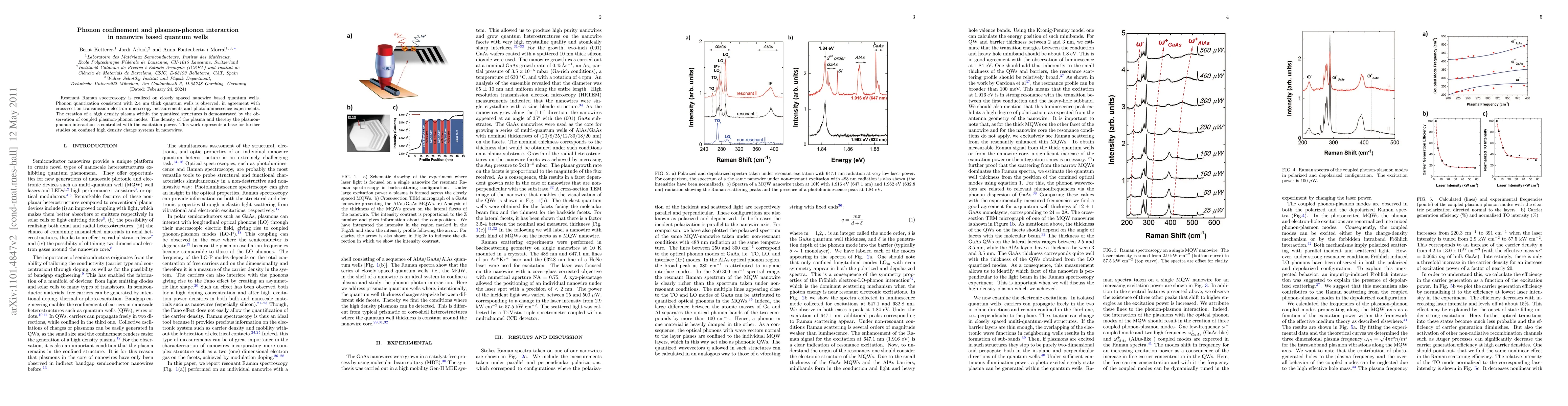 This paper uses resonant Raman spectroscopy to study phonon quantization in nanowire-based quantum wells, confirming a 2.4 nm thickness. It also demonstrates coupled plasmon-phonon modes, showing high-density plasma within these structures, with the plasmon-phonon interaction intensity controlled by excitation power.
