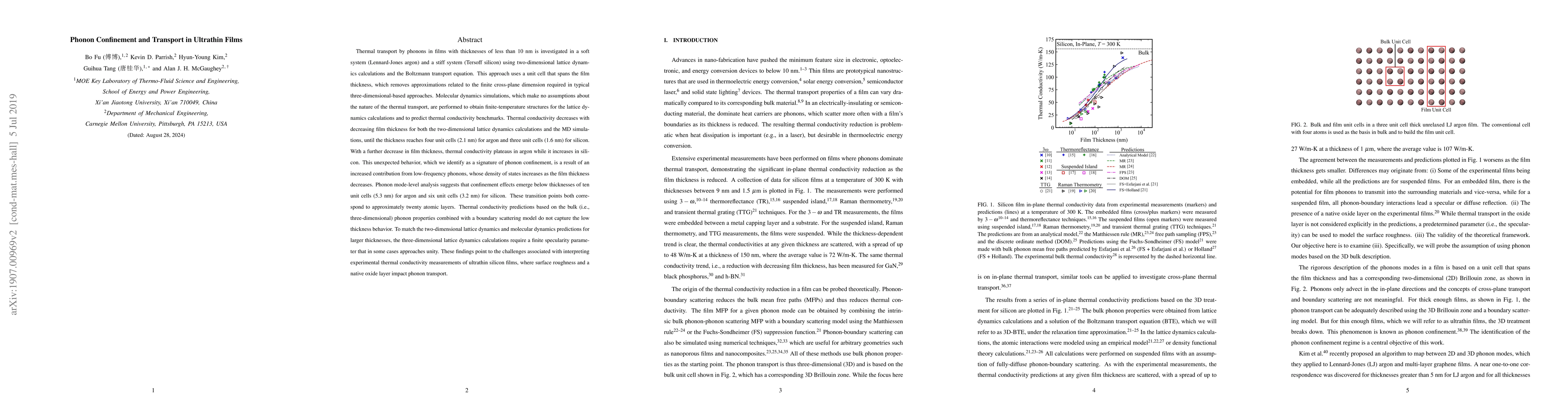 Thermal transport by phonons in films with thicknesses of less than 10 nm is investigated in a soft system (Lennard-Jones argon) and a stiff system (Tersoff silicon) using two-dimensional lattice dynamics calculations and the Boltzmann transport equation. This approach uses a unit cell that spans the film thickness, which removes approximations related to the finite cross-plane dimension required in typical three-dimensional-based approaches. Molecular dynamics simulations are performed to obtain finite-temperature structures for the lattice dynamics calculations and to predict thermal conductivity benchmarks. Thermal conductivity decreases with decreasing film thickness until the thickness reaches four unit cells (2.1 nm) for argon and three unit cells (1.6 nm) for silicon. With a further decrease in film thickness, thermal conductivity plateaus in argon while it increases in silicon. This unexpected behavior, which we identify as a signature of phonon confinement, is a result of an increased contribution from low-frequency phonons, whose density of states increases as the film thickness decreases. Phonon mode-level analysis suggests that confinement effects emerge below thicknesses of ten unit cells (5.3 nm) for argon and six unit cells (3.2 nm) for silicon. Thermal conductivity predictions based on the bulk phonon properties combined with a boundary scattering model do not capture the low thickness behavior. To match the two-dimensional lattice dynamics and molecular dynamics predictions for larger thicknesses, the three-dimensional lattice dynamics calculations require a finite specularity parameter that in some cases approaches unity. These findings point to the challenges associated with interpreting experimental thermal conductivity measurements of ultrathin silicon films, where surface roughness and a native oxide layer impact phonon transport.