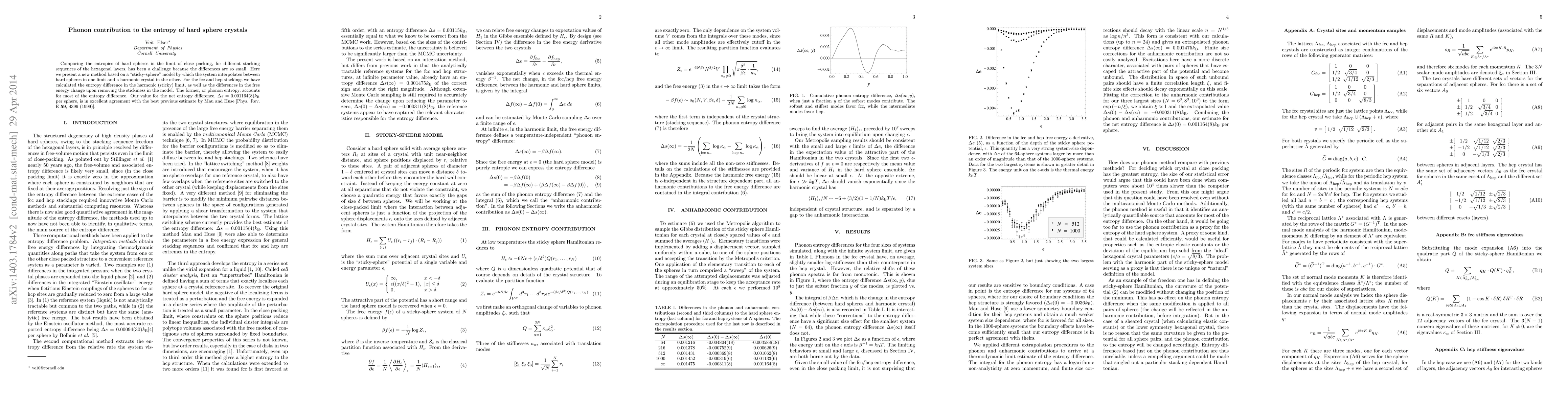 Comparing the entropies of hard spheres in the limit of close packing, for different stacking sequences of the hexagonal layers, has been a challenge because the differences are so small. Here we present a new method based on a "sticky-sphere" model by which the system interpolates between hard spheres in one limit and a harmonic crystal in the other. For the fcc and hcp stackings we have calculated the entropy difference in the harmonic (sticky) limit, as well as the differences in the free energy change upon removing the stickiness in the model. The former, or phonon entropy, accounts for most of the entropy difference. Our value for the net entropy difference, 0.001164(8) k_B per sphere, is in excellent agreement with the best previous estimate by Mau and Huse [Phys. Rev. E 59, 4396 (1999)].