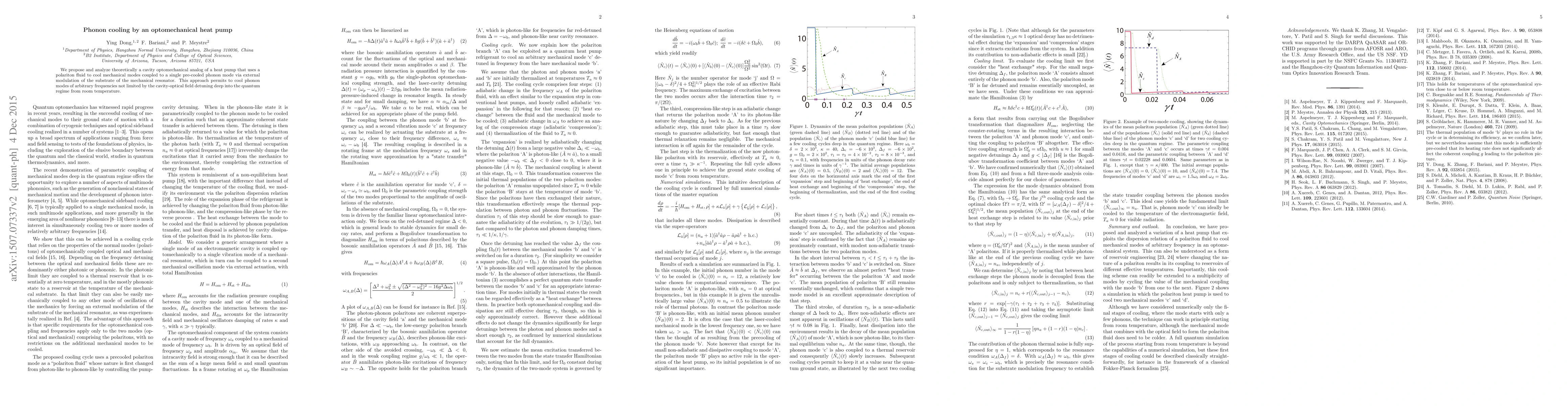 We propose and analyze theoretically a cavity optomechanical analog of a heat pump that uses a polariton fluid to cool mechanical modes coupled to a single pre-cooled phonon mode via external modulation of the substrate of the mechanical resonator. This approach permits to cool phonon modes of arbitrary frequencies not limited by the cavity-optical field detuning deep into the quantum regime from room temperature.