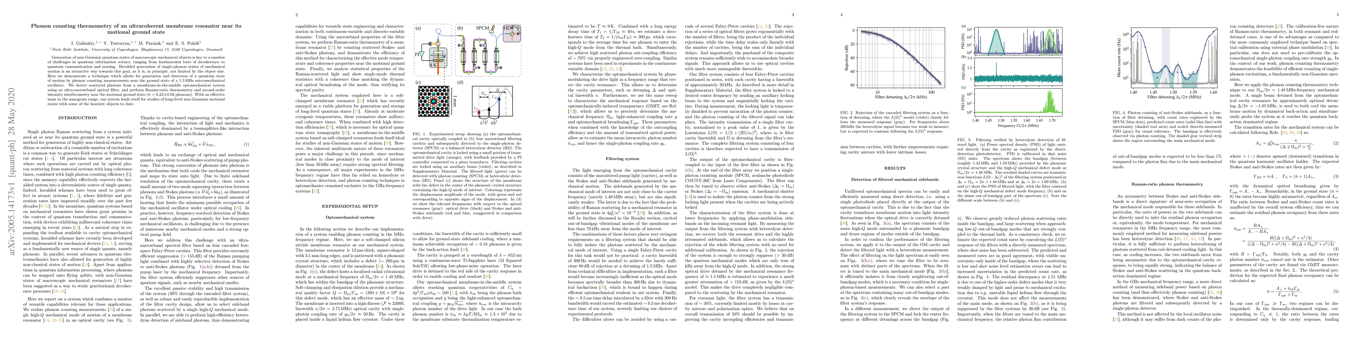 Generation of non-Gaussian quantum states of macroscopic mechanical objects is key to a number of challenges in quantum information science, ranging from fundamental tests of decoherence to quantum communication and sensing. Heralded generation of single-phonon states of mechanical motion is an attractive way towards this goal, as it is, in principle, not limited by the object size. Here we demonstrate a technique which allows for generation and detection of a quantum state of motion by phonon counting measurements near the ground state of a 1.5 MHz micromechanical oscillator. We detect scattered photons from a membrane-in-the-middle optomechanical system using an ultra-narrowband optical filter, and perform Raman-ratio thermometry and second-order intensity interferometry near the motional ground state ($\bar{n}=0.23\pm0.02$ phonons). With an effective mass in the nanogram range, our system lends itself for studies of long-lived non-Gaussian motional states with some of the heaviest objects to date.