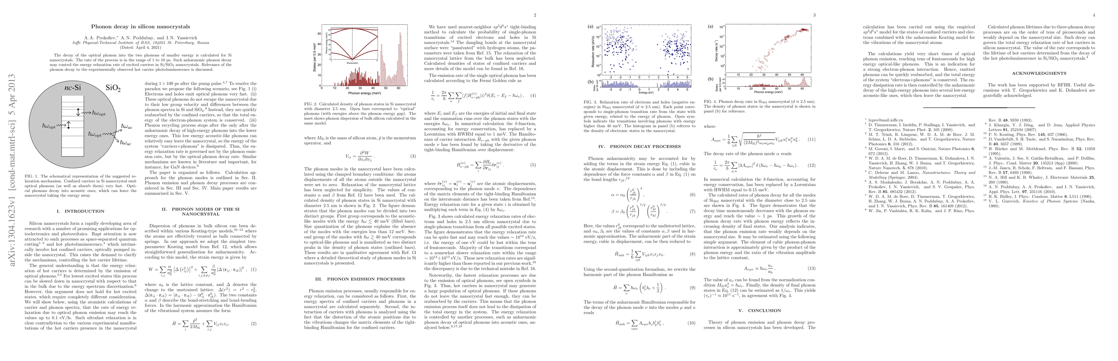 This study calculates the rate of optical phonon decay into two lower-energy phonons in silicon nanocrystals, finding it to range from 1 to 10 picoseconds. This anharmonic decay process is suggested to influence the energy relaxation of excited carriers and is linked to the observed hot carrier photoluminescence.