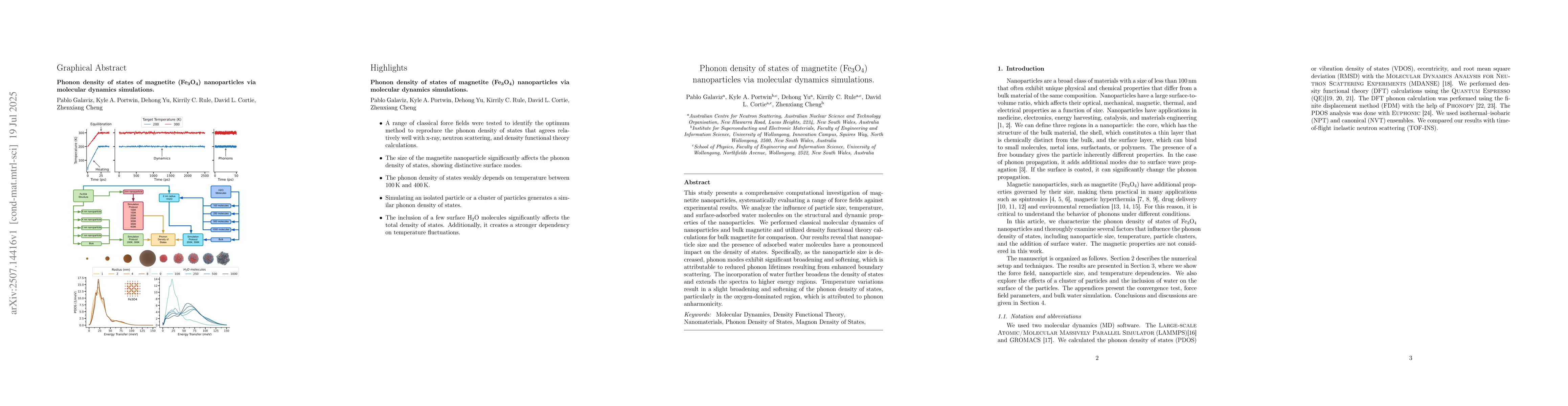 This study presents a comprehensive computational investigation of magnetite nanoparticles, systematically evaluating a range of force fields against experimental results. We analyze the influence of particle size, temperature, and surface-adsorbed water molecules on the structural and dynamic properties of the nanoparticles. We performed classical molecular dynamics of nanoparticles and bulk magnetite and utilized density functional theory calculations for bulk magnetite for comparison. Our results reveal that nanoparticle size and the presence of adsorbed water molecules have a pronounced impact on the density of states. Specifically, as the nanoparticle size is decreased, phonon modes exhibit significant broadening and softening, which is attributable to reduced phonon lifetimes resulting from enhanced boundary scattering. The incorporation of water further broadens the density of states and extends the spectra to higher energy regions. Temperature variations result in a slight broadening and softening of the phonon density of states, particularly in the oxygen-dominated region, which is attributed to phonon anharmonicity.