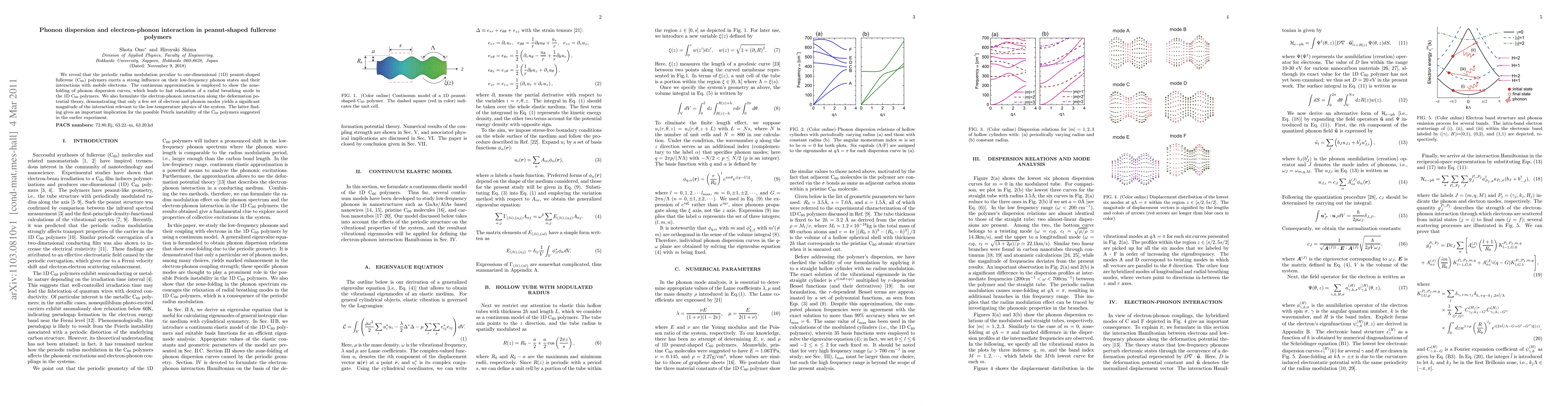 Researchers studied the properties of peanut-shaped fullerene polymers, finding that their low-frequency phonon states and interactions with electrons are influenced by periodic radius modulation, leading to potential Peierls instability.