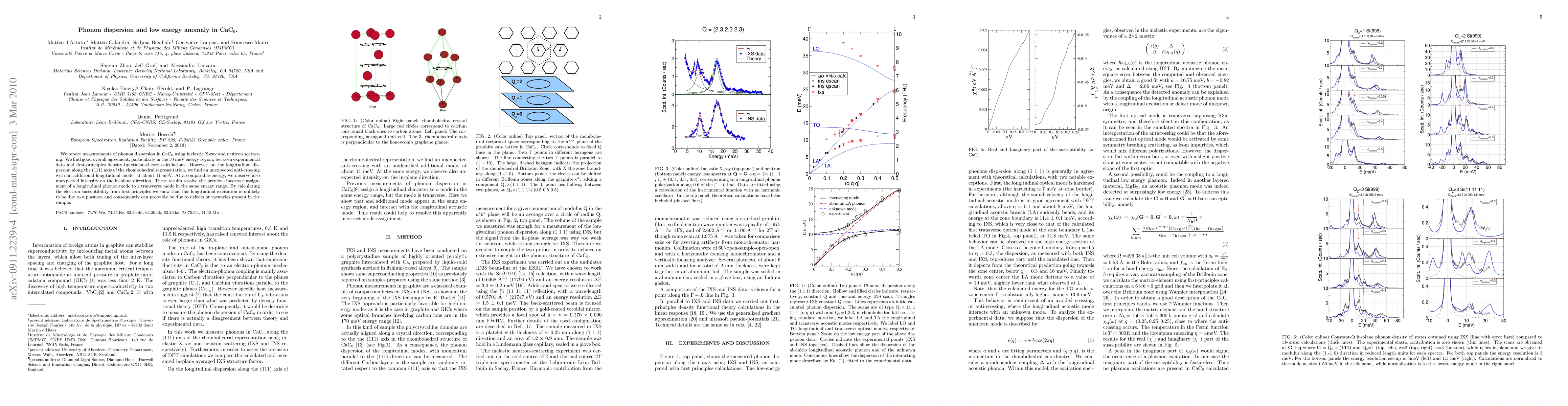 We report measurements of phonon dispersion in CaC$_6$ using inelastic X-ray and neutron scattering. We find good overall agreement, particularly in the 50 meV energy region, between experimental data and first-principles density-functional-theory calculations. However, on the longitudinal dispersion along the $(1 1 1)$ axis of the rhombohedral representation, we find an unexpected anti-crossing with an additional longitudinal mode, at about 11 meV. At a comparable energy, we observe also unexpected intensity on the in-plane direction. These results resolve the previous incorrect assignment of a longitudinal phonon mode to a transverse mode in the same energy range. By calculating the electron susceptibility from first principles we show that this longitudinal excitation is unlikely to be due to a plasmon and consequently can probably be due to defects or vacancies present in the sample.