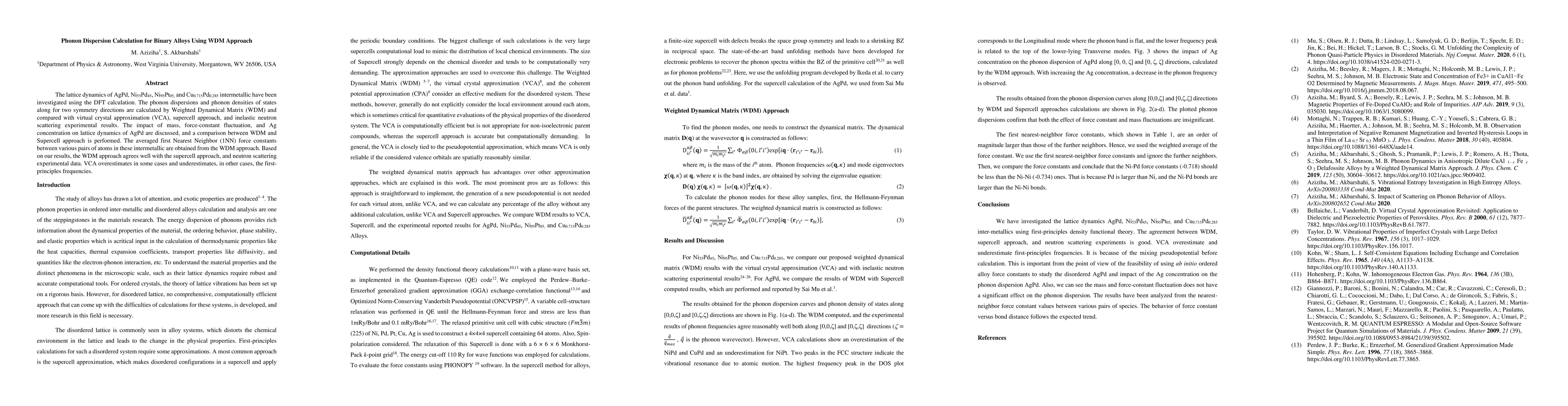 A study uses density functional theory to calculate phonon dispersion in binary alloys, comparing results with experimental data and other methods, finding the Weighted Dynamical Matrix approach agrees well with supercell calculations and neutron scattering.