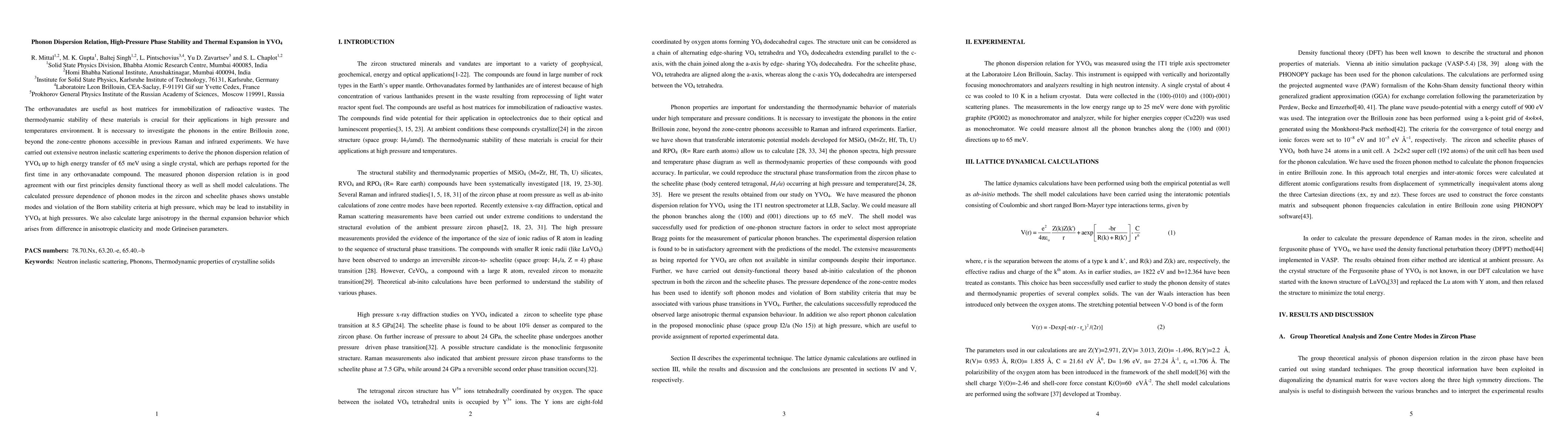 This paper investigates the phonon dispersion relation in YVO4 using neutron inelastic scattering, revealing its high-pressure phase stability and thermal expansion. The findings suggest potential instability in YVO4 at high pressures due to unstable phonon modes and violate the Born stability criteria.