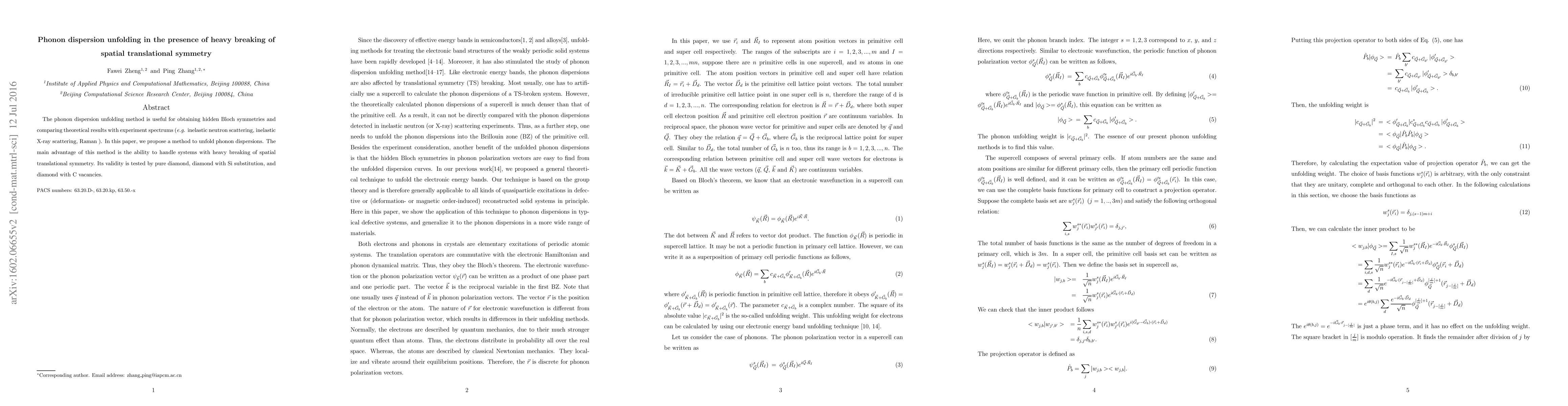 This paper proposes a phonon dispersion unfolding method to reveal hidden Bloch symmetries in systems with significant spatial translational symmetry breaking, validated through studies on pure diamond, diamond with Si substitution, and diamond with C vacancies. The method aids in comparing theoretical results with experimental spectrums.