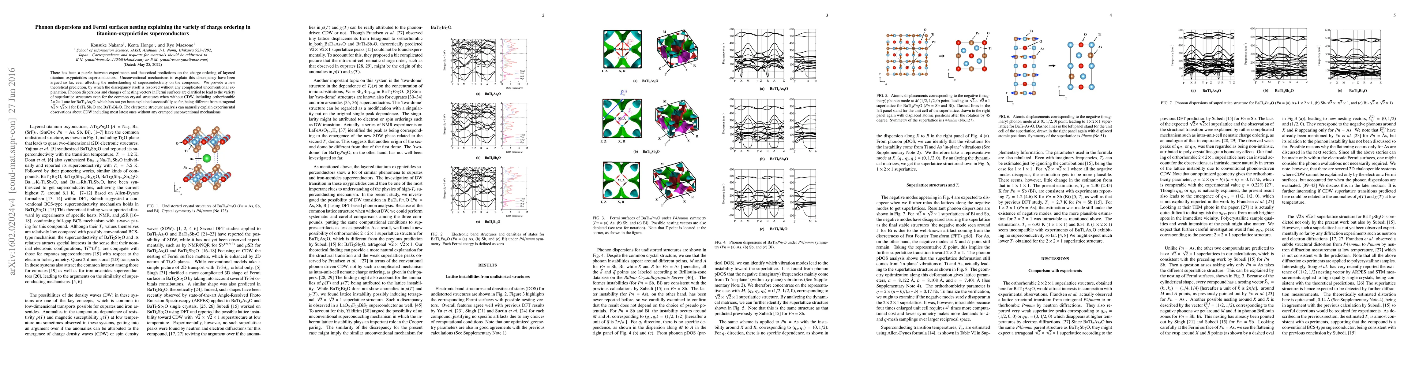 This paper resolves the discrepancy between experimental and theoretical predictions regarding charge ordering in titanium-oxypnictides superconductors by attributing it to phonon dispersions and changes in Fermi surface nesting vectors, providing a straightforward explanation without invoking unconventional mechanisms. This approach successfully explains the variety of superlattice structures observed in different compounds.