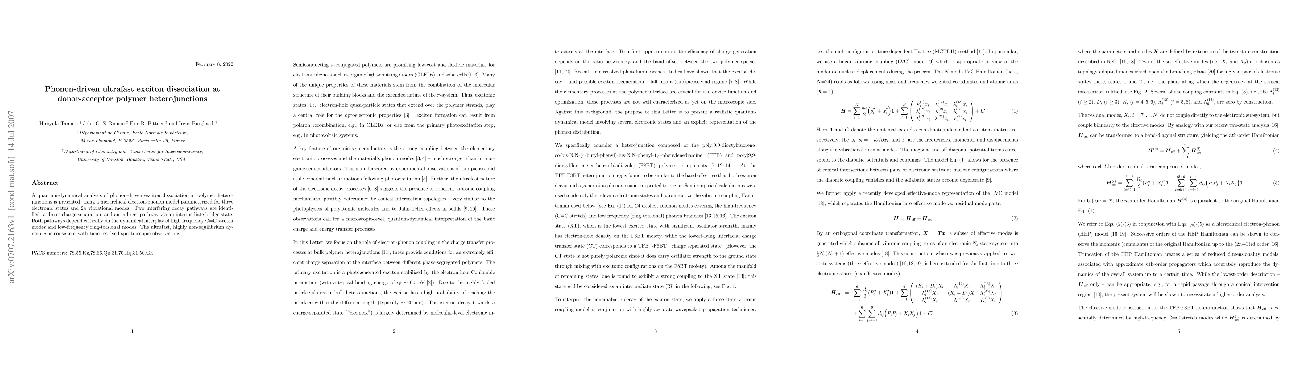 This study employs a quantum-dynamical model to analyze phonon-driven exciton dissociation at polymer heterojunctions, identifying two decay pathways influenced by specific phonon modes, and aligns with time-resolved spectroscopic findings on ultrafast dynamics.