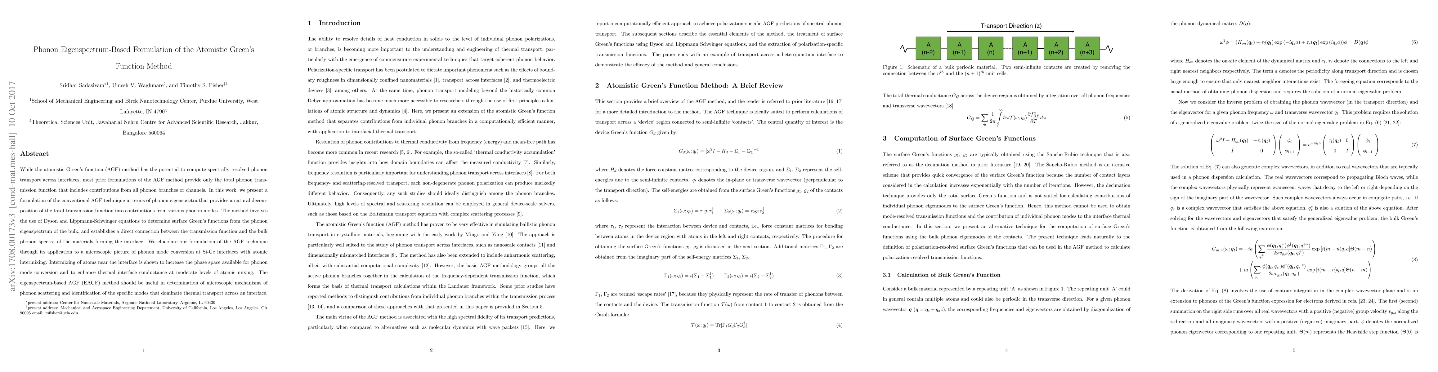 This paper introduces a phonon eigenspectrum-based formulation of the atomistic Green's function (AGF) method, enabling spectrally resolved phonon transport analysis. The method decomposes total phonon transmission into contributions from various phonon modes, enhancing the understanding of phonon mode conversion and thermal interface conductance at Si-Ge interfaces.