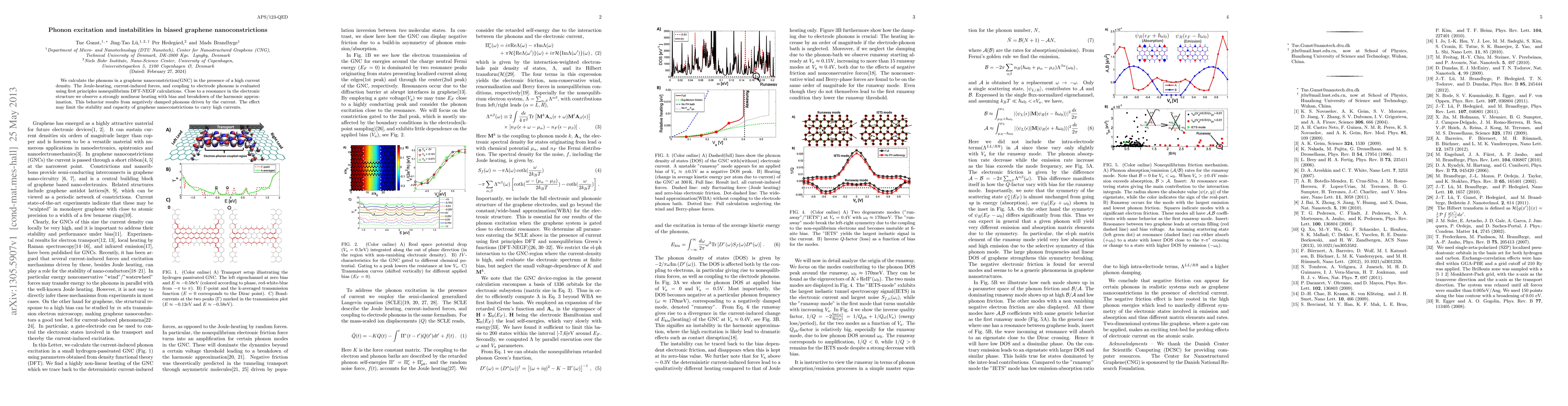 This study investigates phonon excitations in graphene nanoconstrictions under high current densities, revealing nonlinear heating and phonon instabilities due to current-induced forces, which may limit the current-carrying capacity of graphene nanoconstrictions. The findings are derived from first principles nonequilibrium DFT-NEGF calculations.