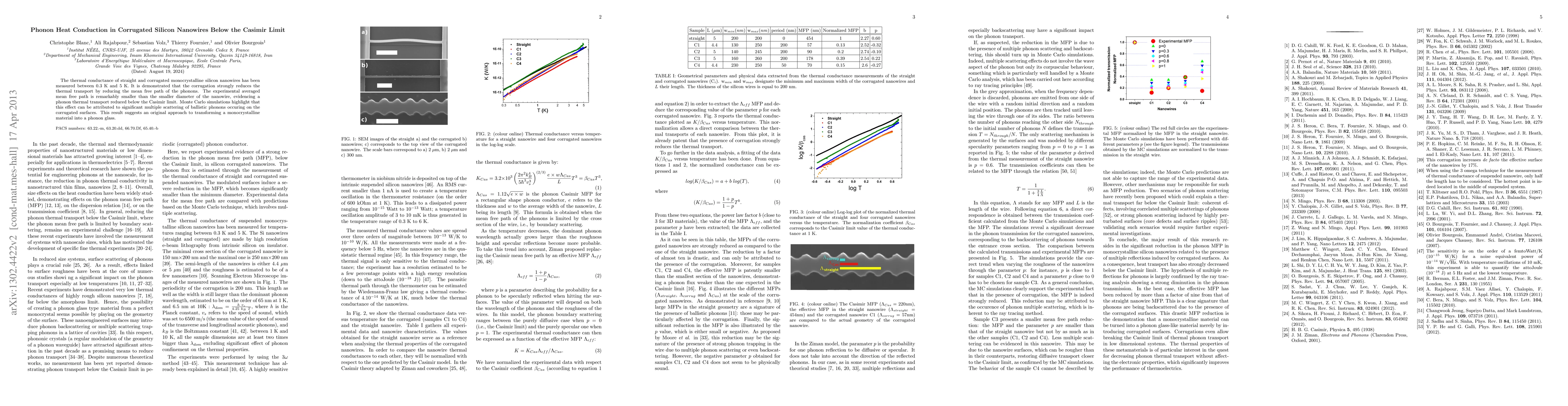 This study measures thermal conductance in silicon nanowires, finding that corrugated structures significantly reduce phonon mean free paths below the Casimir limit, attributed to enhanced phonon scattering on corrugated surfaces. This suggests a novel method to create phonon glasses from monocrystalline materials.