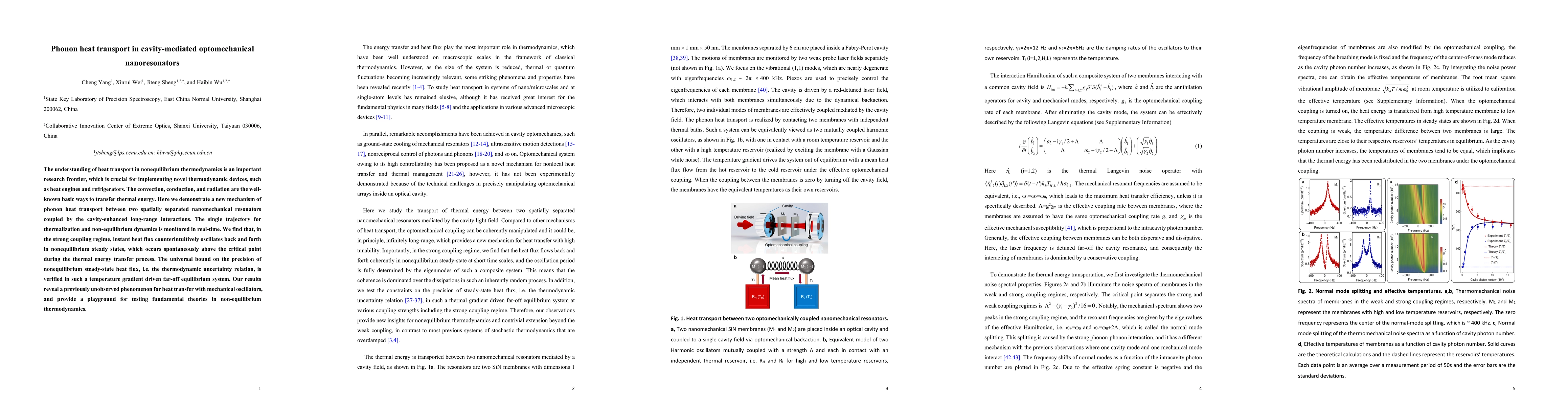 This paper explores a novel phonon heat transport mechanism in optomechanical nanoresonators connected via cavity-mediated interactions, revealing counterintuitive oscillations in heat flux above a critical point. The findings validate the thermodynamic uncertainty relation and offer insights into non-equilibrium thermodynamics.